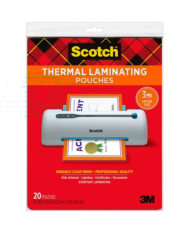 Scotch Thermal Laminator Pouches protect documents you handle frequently. These 3 mil thick thermal laminating pouches are for use with thermal laminators to. Pouches are clear to let important information show through.Specifications