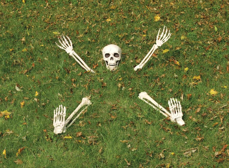 Do you want to turn all Hallows eve into a full-blown night of the living dead down at your end of the block? It’s actually not that hard! All it takes is a dark sense of humor, a little can-do spirit, and this 5 Piece Buried Alive Skeleton Kit!This ingenious kit features lawn implantable bone appendagesa realistic looking skull, forearms, and legs with articulated hands and feetthat are stake mounted for easy installation into the ground. It will really look like the dead are rising from their earthen graves, right in your front lawn! We just hope that you don’t come across any real skeletons while you are staging these pieces, they have been known to crawl out from the dirt to defend their own kind. That’s how believable this kit really is!Specifications