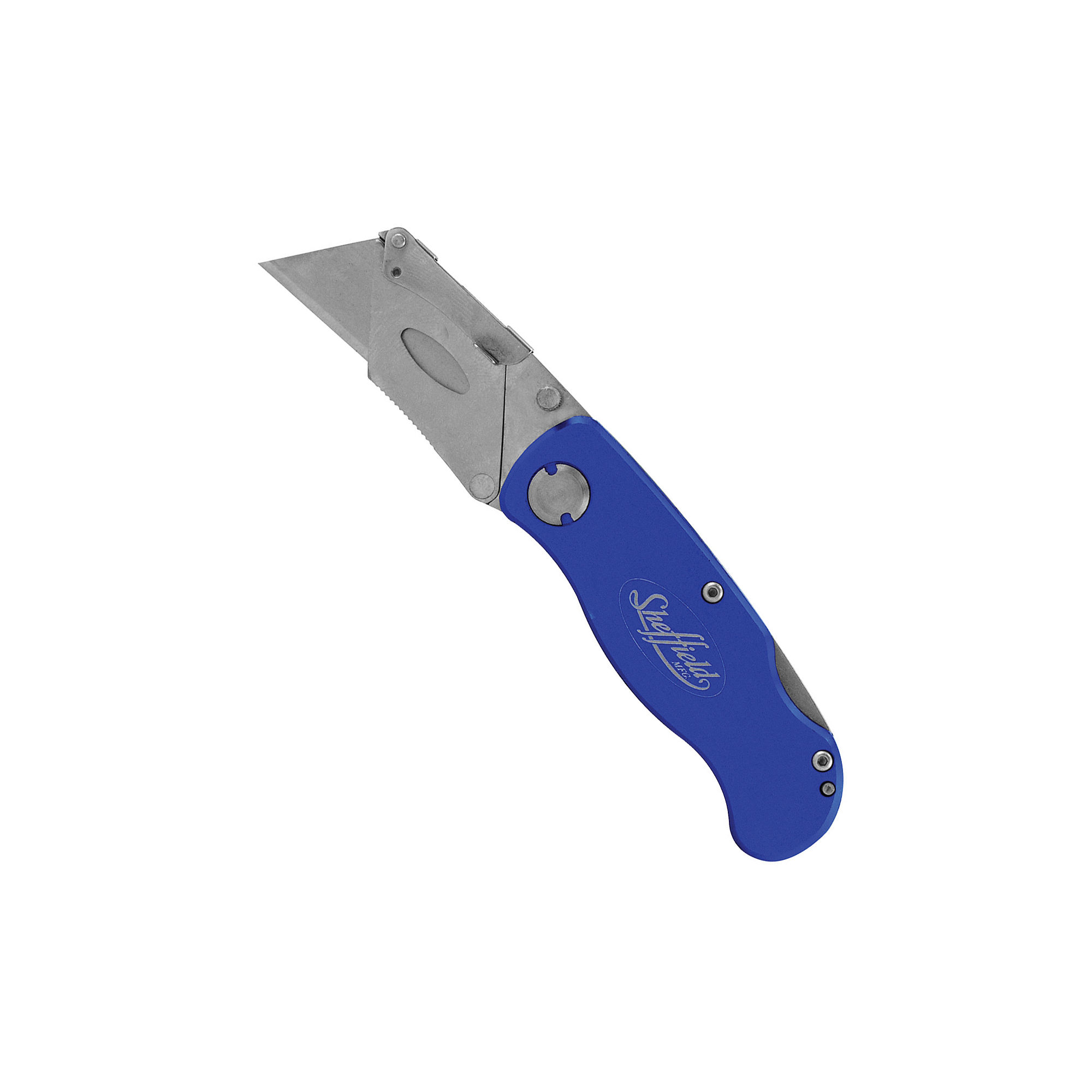 This innovative, useful tool combines the best features of a lock back knife with a utility knife. Sturdy, aluminum handle features foldout blade housing for increased safety. Convenient blade lock can be opened quickly with just one hand for easy access. Snap lock and sliding mechanism allow you to easily change the standard-size blade.Sheffield Great NeckLockback Utility Knife, Blue.Specifications