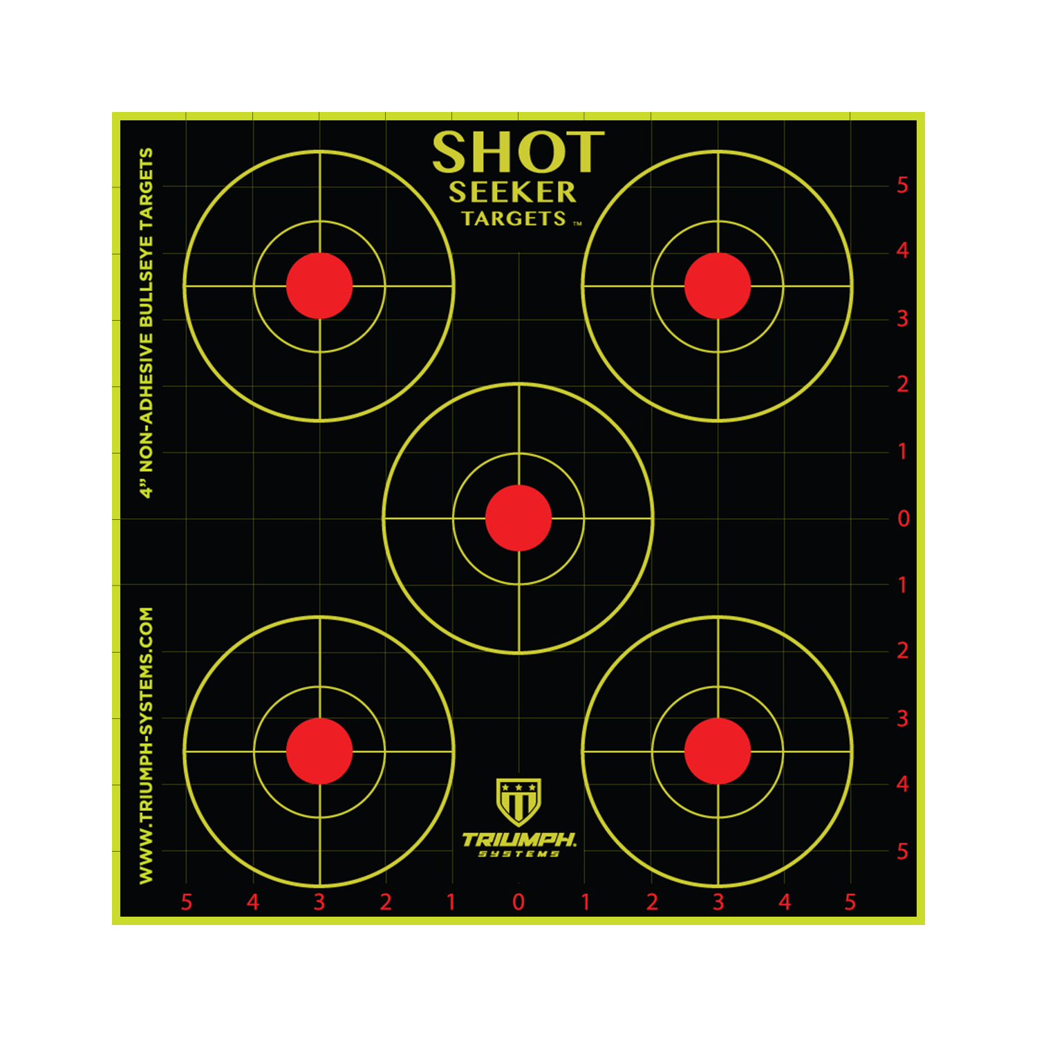 Shot Seeker NON Adhesive bullseye targets show a big shot burst with a bright yellow halo at the impact location. Identify and score your shot from the firing line. This target is 12 inx12 in that has five 4 in targets to perfect your aim.The Shot Seekers 1 inch grids are ideal for sighting in your firearm quickly and easily.Specifications