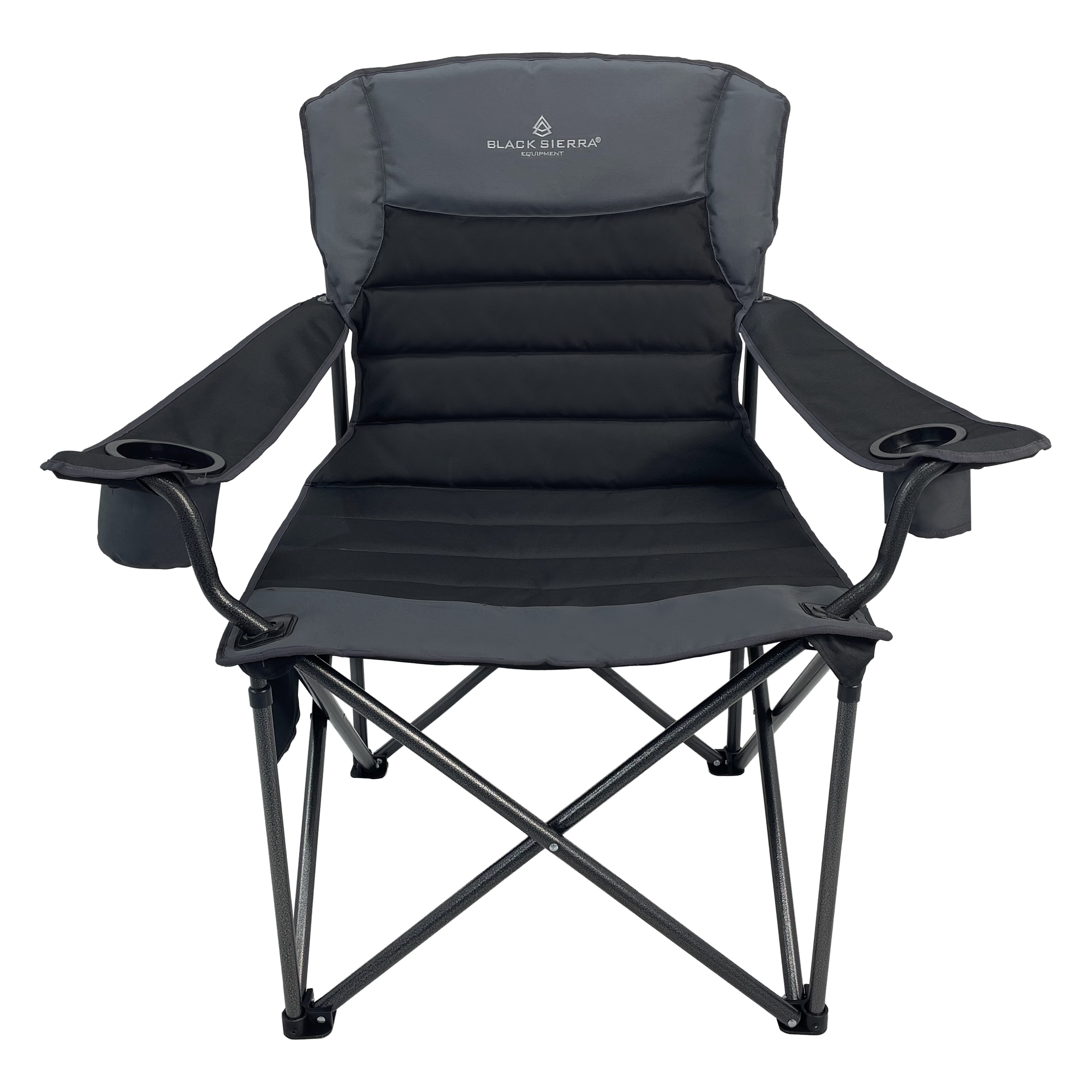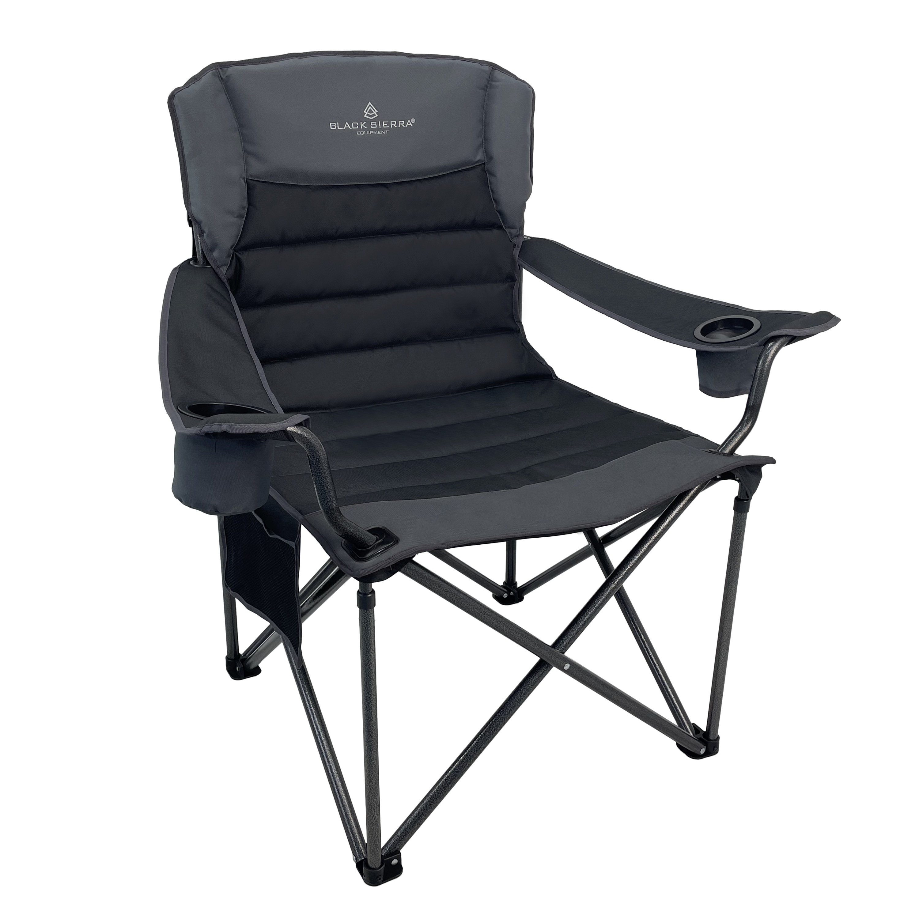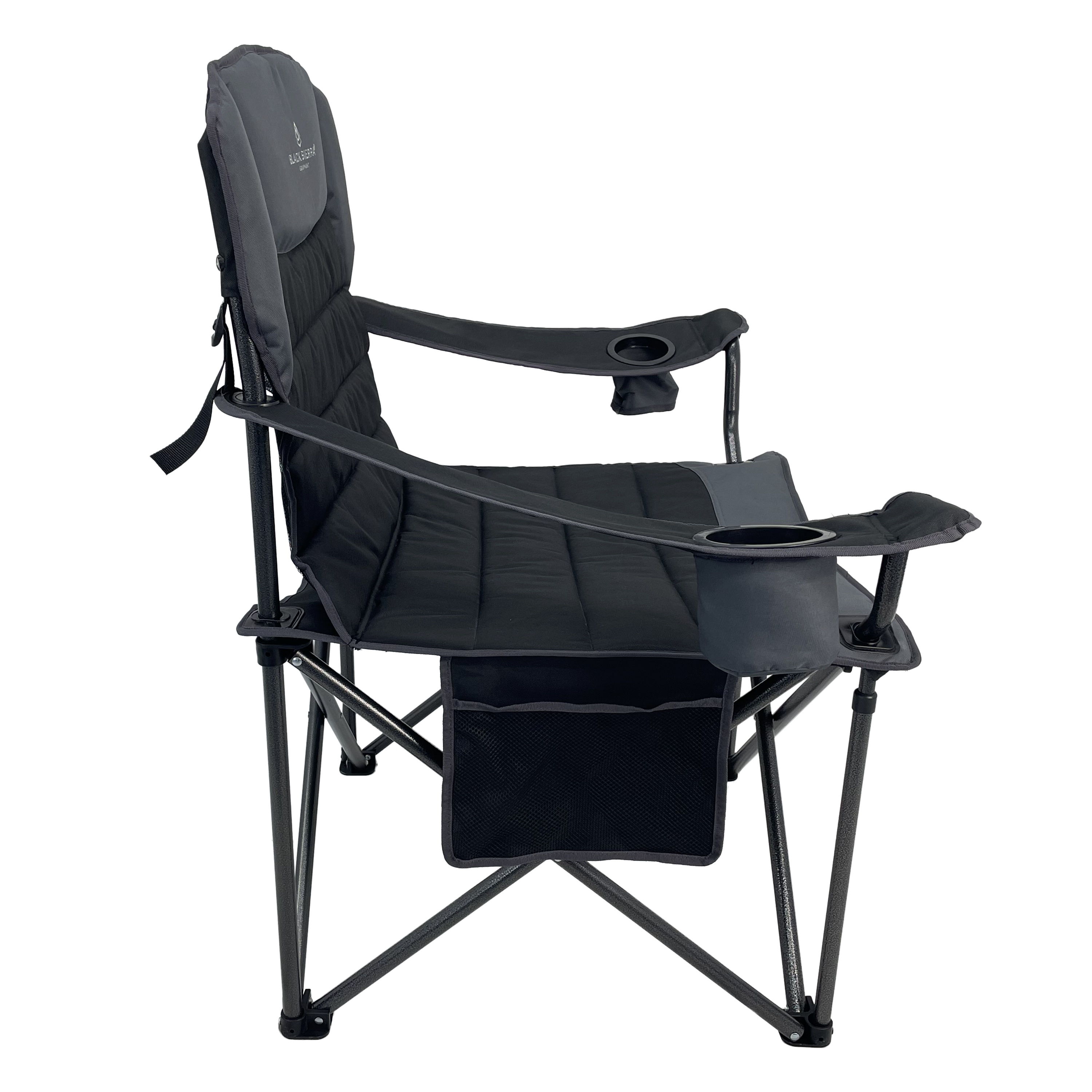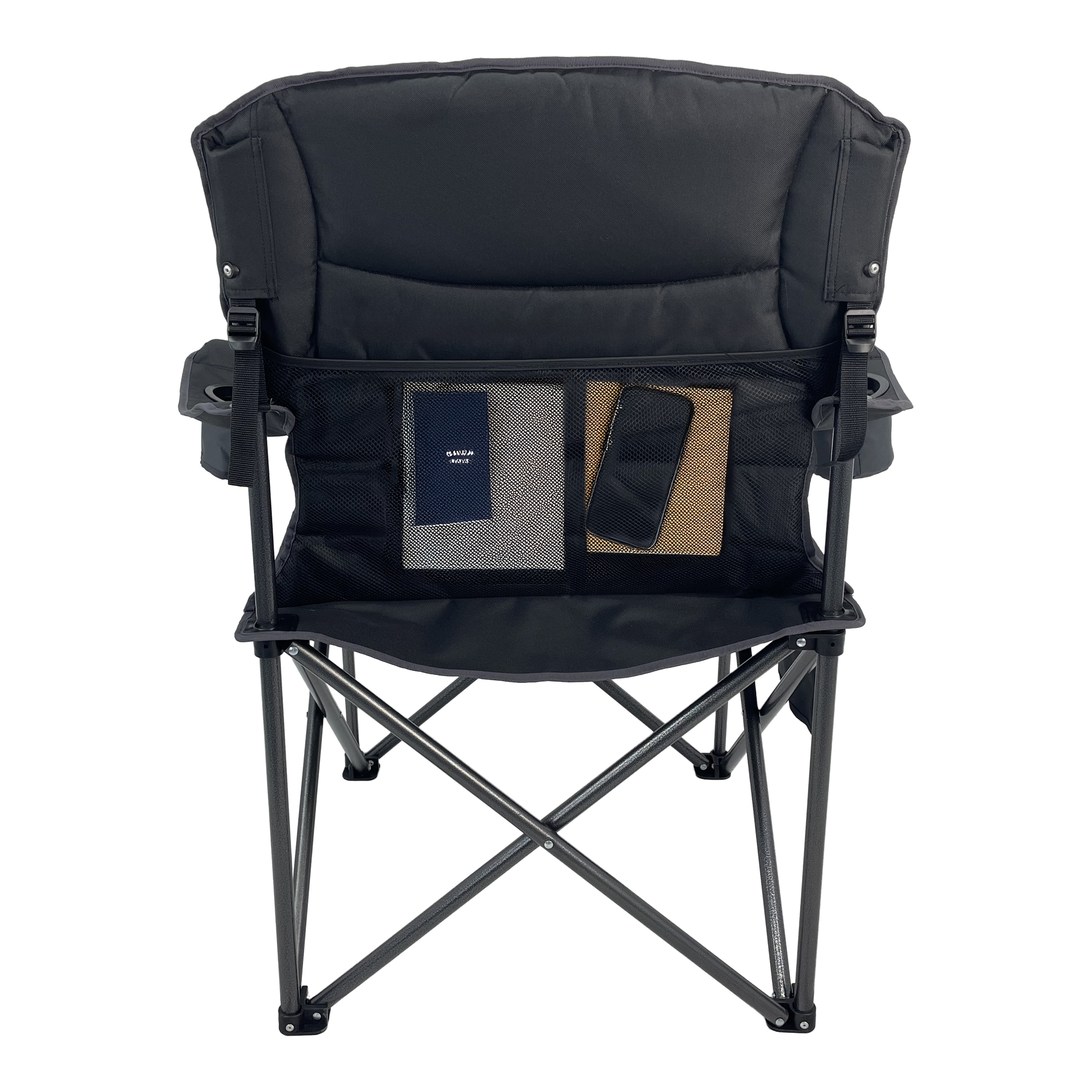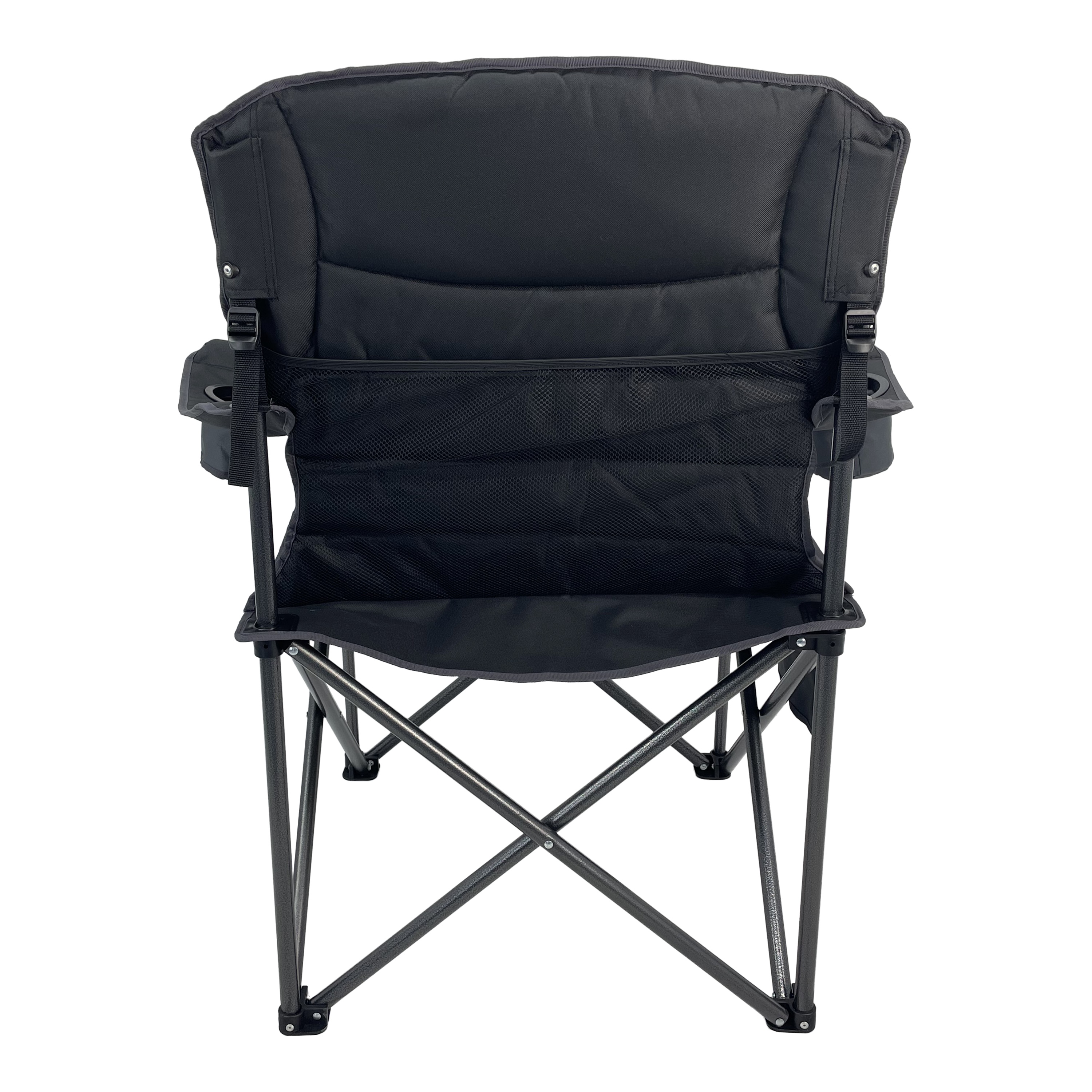 Constructed with durable, weather-resistant polyester fabric and a PE coating, this extra-wide, heavy-duty quad chair is made to perform in rugged outdoor settings from campsites to tailgates. Enjoy all-day relaxation with plush padded seating and a cushioned backrest. Adjustable armrests let you customize your comfort, dual cup holders including one oversized insulated holder keep your favorite drinks right within reach. Features a side storage pocket for small essentials like your phone or keys, and a large mesh pocket on the back perfect for stashing a blanket, book, or extra gear. With a powder-coated steel frame that supports up to 500 lbs, this XL chair offers generous space (40 H x 40 W x 29 D) and reliable strength for lasting use. Folds up easily and packs into the included carry bag with handle. Take it anywhere from hunting trips to backyard BBQs. Folds in seconds and sets up effortlessly. Whether you’re heading to the sidelines, the woods, or a bonfire, the Silverback XL is your grab-and-go seating solution.Specifications