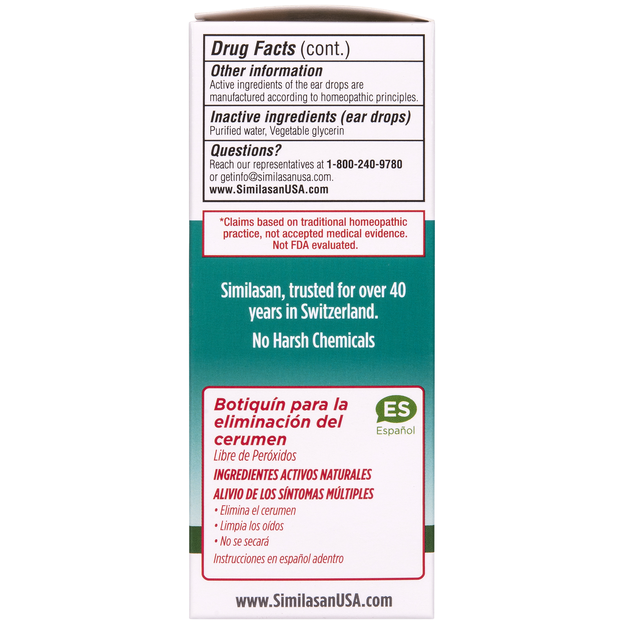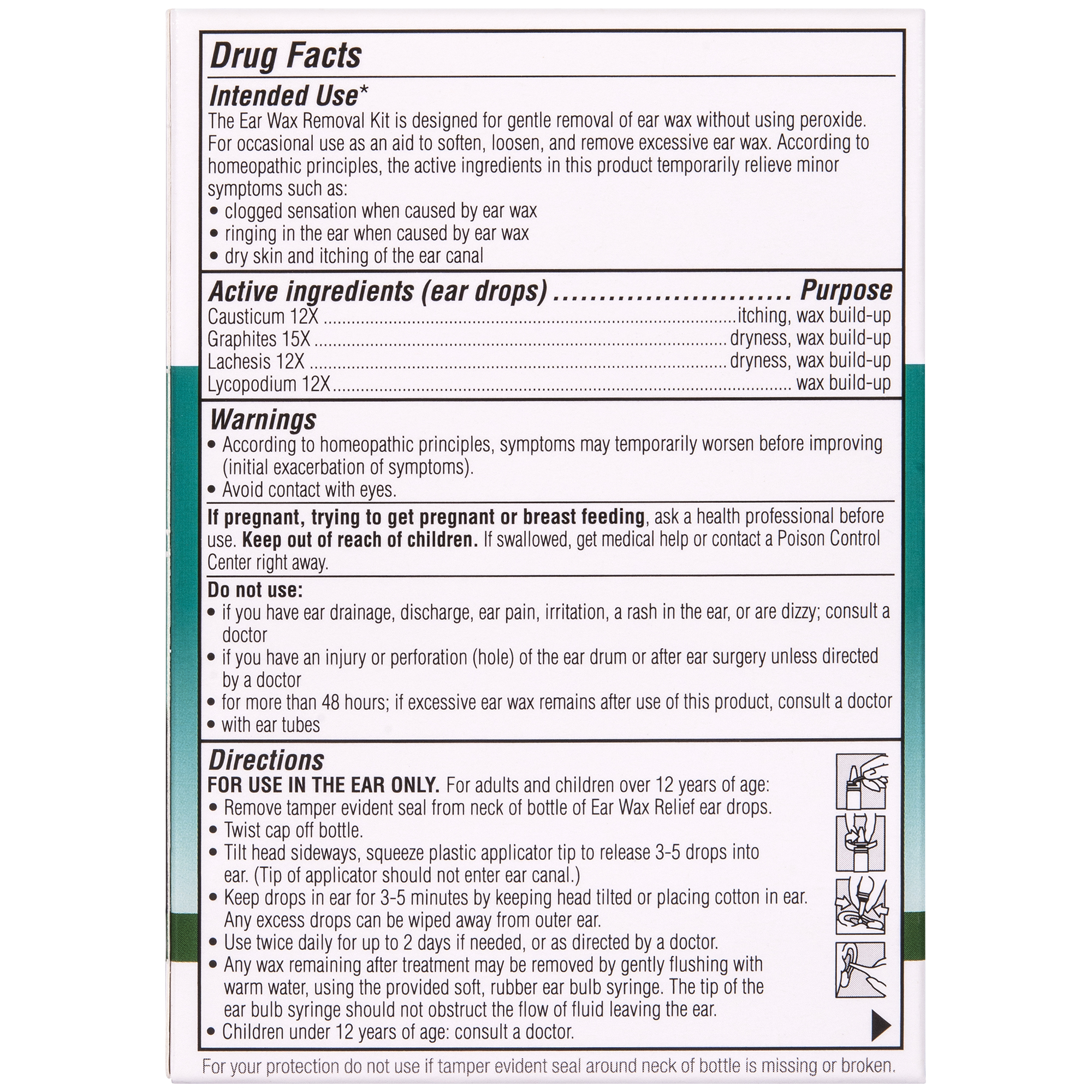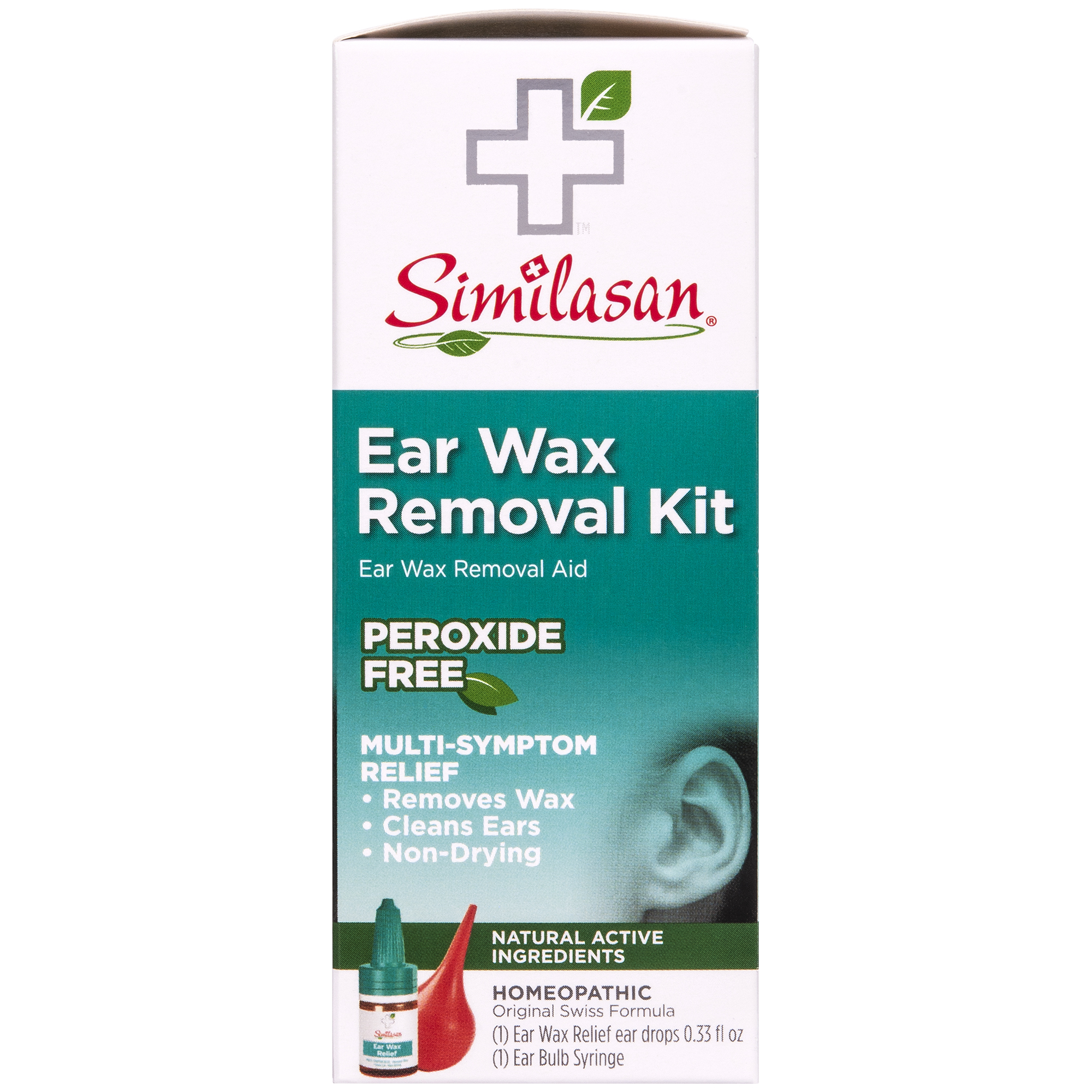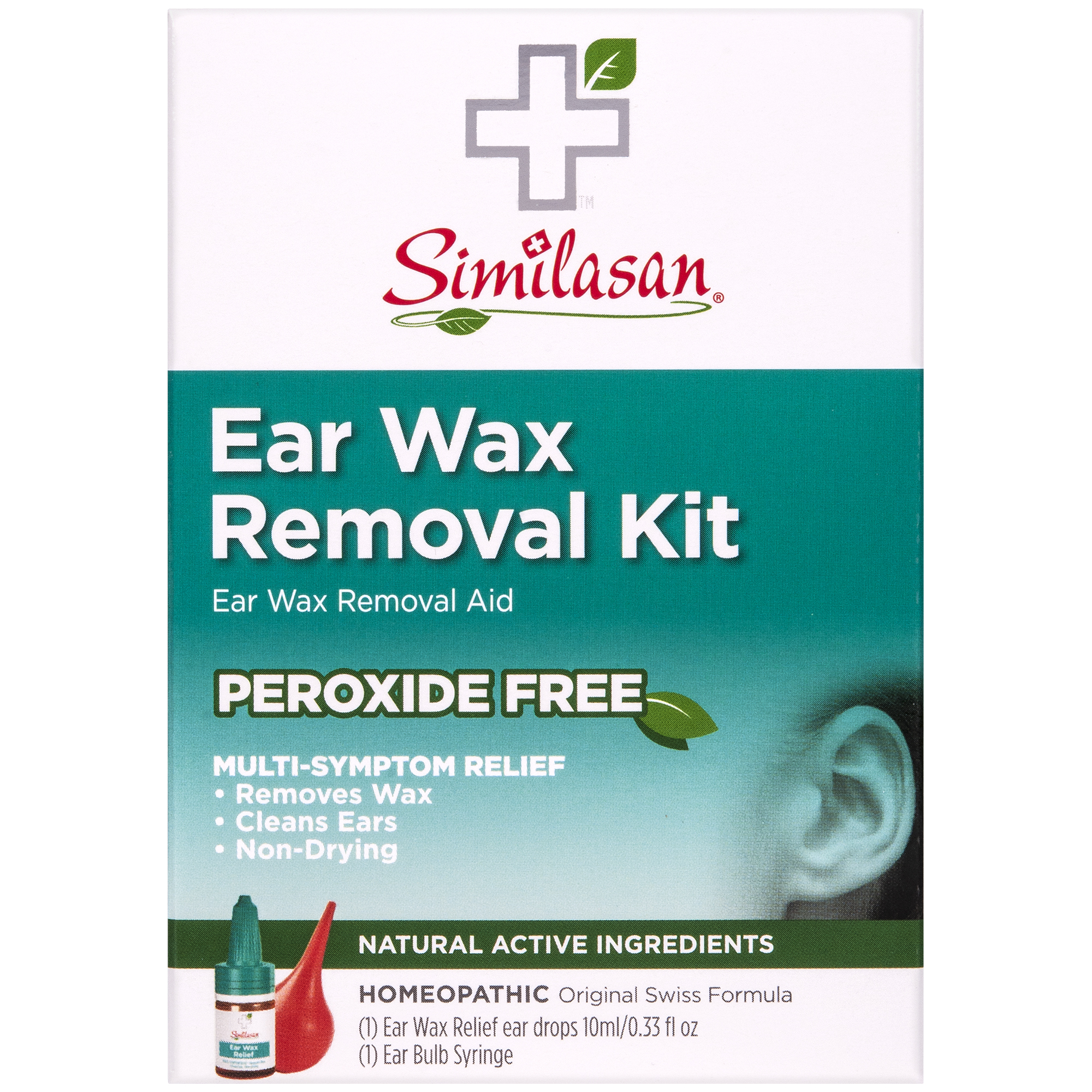 Ear Wax Removal Kit. Removes wax and cleans ears without harsh peroxide. Your body should maintain a balanced level of ear wax production, but when that balance is disturbed, it can result in discomfort.Similasan Ear Wax Removal Kit can help temporarily relieve your discomfort by removing excessive ear wax while cleaning the ear. It helps naturally maintain normal wax levels without harsh peroxide. Ear Wax Relief ear drops stimulate the body's natural ability to reduce ear wax congestion, while the bulb syringe flushes excess wax and cleans the ear. Now you can relieve that clogged sensation, ringing and itching in the ear canal without drying your ear.Specifications