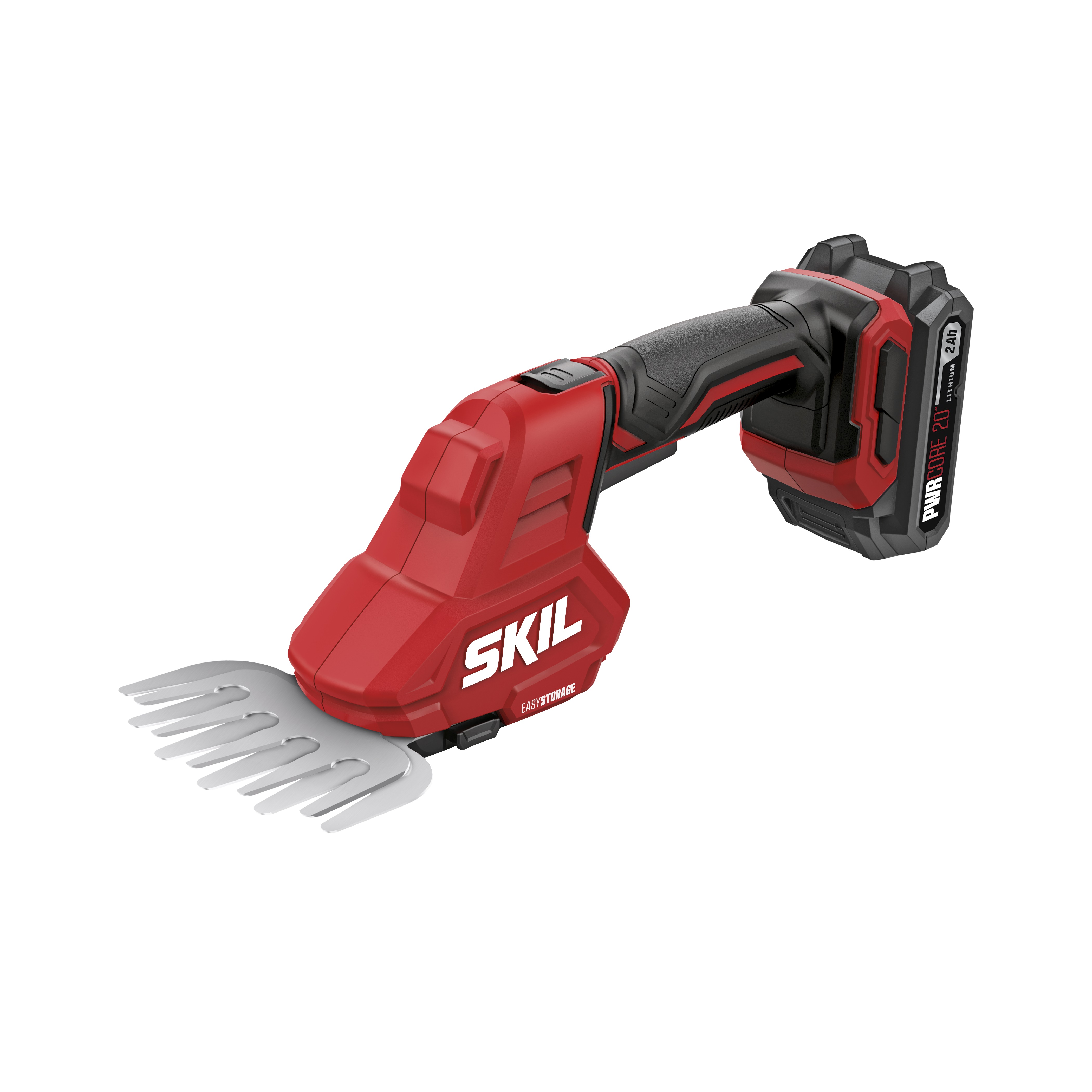 Maintain and shape small hedges, and easily cut back hostas, decorative grasses, and other perennials at the end of the season with the SKIL PWR CORE 20V Shear & Shrub 2-in-1. The cordless 20V electric shears feature a compact design for easy one-handed operation and working in tight spaces between plants. Its 2-in-1 design allows multiple types of cutting from trimming back grasses to pruning hedges with its interchangeable dual-action blades. Tool-free blade changes allow quick and easy swaps between its 5-inch grass blade and 8-inch shrub shears blade. Each set of blades feature a 5/16-inch cut capacity for efficient grass trimming and shrub shearing. An EASYSTORAGE bracket allows convenient storage and organization between use. The kit includes the Shear & Shrub 2-in-1 tool, PWR CORE 20V 2.0Ah battery, PWR CORE 20V Standard Charger, and EASYSTORAGE bracket.Specifications