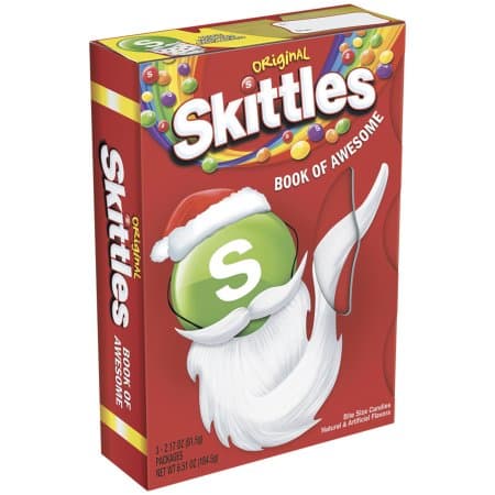 6.51 OZ; Gluten Free; Original Skittles bite-size, chewy, fruity candies with a colorful candy shell; Perfect as holiday gifts, party favors, stocking stuffers, and thank-yous; Skittles Book of Awesome turns into a Santa beard. Take a selfie with your own Santa beard; Taste the Rainbow with sweet, mouth-watering grape, green apple, strawberry, orange, and lemon flavors