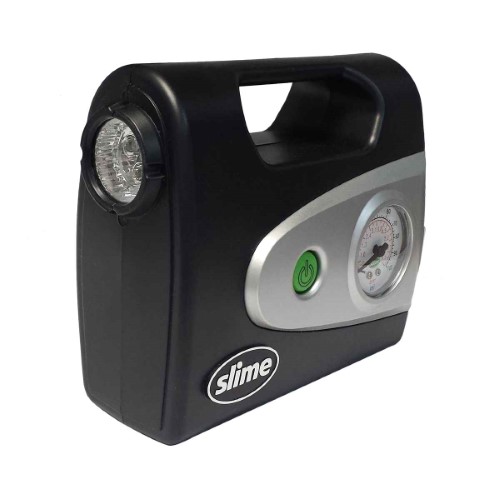 Slime's 12V Tire Inflator is a lean, mean, inflating machine. It's got the essentials, without any added bulk. This compact tire inflator airs up a standard tire from flat to full in 8 minutes. Simply plug it into your 12-volt car accessory port to get started. With its long air and power hoses, plus convenient cord storage, this every day inflator makes inflation a breeze, then packs up neatly for easy storage. Like all Slime tire inflators, this 12V Tire Inflator is tire sensor safe and comes with a 1-year . Its bright LED is there to light your way, when all other lights have gone out. Its built-in dial gauge measures from 0-100 psi and with the push of a button, the inflator springs to life. It can also be used to inflate sports balls, rafts, and floatiest (adapters included with your purchase). It may be compact, but the Slime 12V Tire Inflator packs one heck of a punch.Specifications