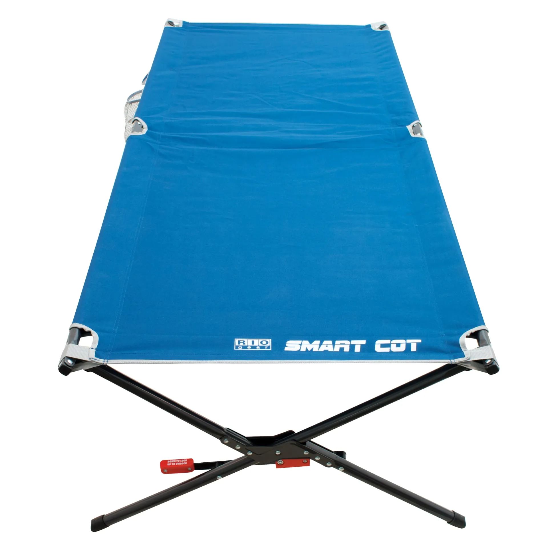 The Rio Gear XL Camping Cot is designed to offer a comfortable user experience with its smooth and reliable blend of materials. It has no loose parts and can be set up in a flash, helping to ensure that you can use it right away. This self-contained Rio Gear camping cot is easy to set up and fold with a patented step-down tension lock stability system. Just push down on the lever to lock and pull up to unlock. It features a powder-coated steel frame with polyester fabric bed and easy-access side cot storage. The innovative design of this camping furniture eliminates the need for end bars, providing more head and ankle comfort. It includes a zippered carry bag with handles for easy storage and transport. The cot has a bright, solid color that makes it highly visible for added convenience. This camping cot can be used for a variety of sleeping purposes, from camping to visiting family when traveling. The Rio Gear XL Camping Cot can make a handy addition to your camping gear with its sturdy and simple-to-use constructionSpecifications