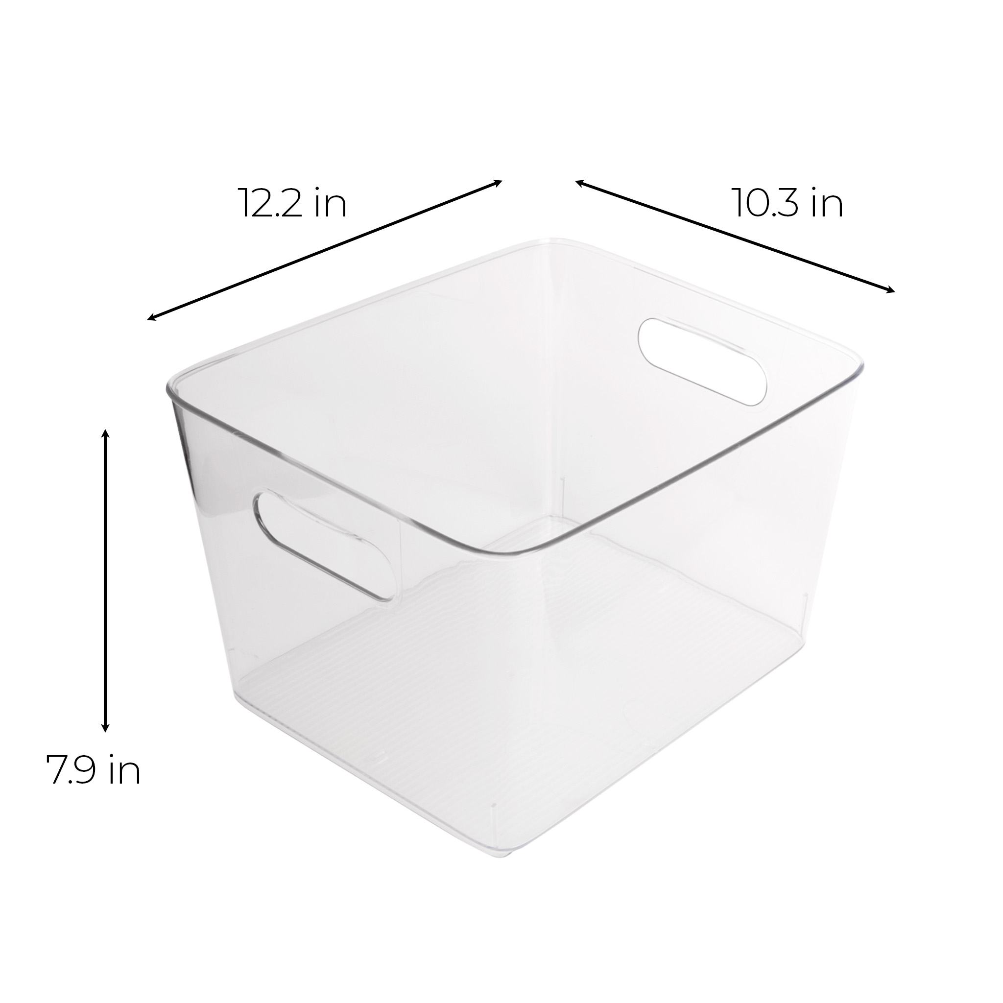 Organize your entire refrigerator or pantry with our large storage bin. Its clear design for easy visibility of contents and easy grip handles make this a must-have in every kitchen.Package Includes Large Storage BinFits most standard-size refrigerator; measure shelf dimensions for proper fit. Ideal for organizing the refrigerator or pantry.Features and Benefits This design is made from BPA-free polyethylene making it refrigerator and freezer safe. The clear design allows for easy visibility of the contents and features easy carry handles.Product Specifications Dimensions: 12 (W) x 10 (D) x 7.7 (H) inches Design: Large Storage BinColor: Clear Material: BPA Free PolyethyleneSpecifications