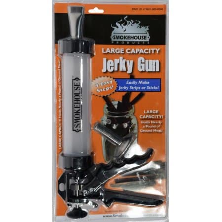 The Smokehouse Jerky Gun comes with two stainless steel tips, one for making jerky strips and the other for round snack sticks (which is what we love to use for making pepperoni). The mechanism is made of corrosion resistant metal for years of trouble free service. The tube is one of the largest in the industry and can handle nearly 1 lb. of ground meat per load. The handle is machined aluminum making it extremely durable and lightweight for ease of use.Making your own homemade jerky and pepperoni is easy to do. Just fill the tube on the jerky gun with ground meat seasoned with one of our fine Smokehouse Jerky Dry Rub and Mix seasonings, our Smokehouse Pepperoni Sausage Mix or your own recipe. Attach one of the two tips included; then squeeze the handle for jerky strips or sticks. Place the strips or sticks on the Smokehouse Drying Screens for easy handling and cleanup, then place them right in the smoker (or even your oven).Specifications