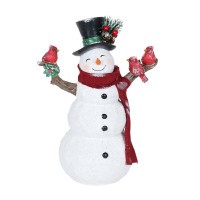 11.5 IN TALL; HAT AND FABRIC SCARF; HOLDING 3 CARDINALS; SNOWMAN STATUE