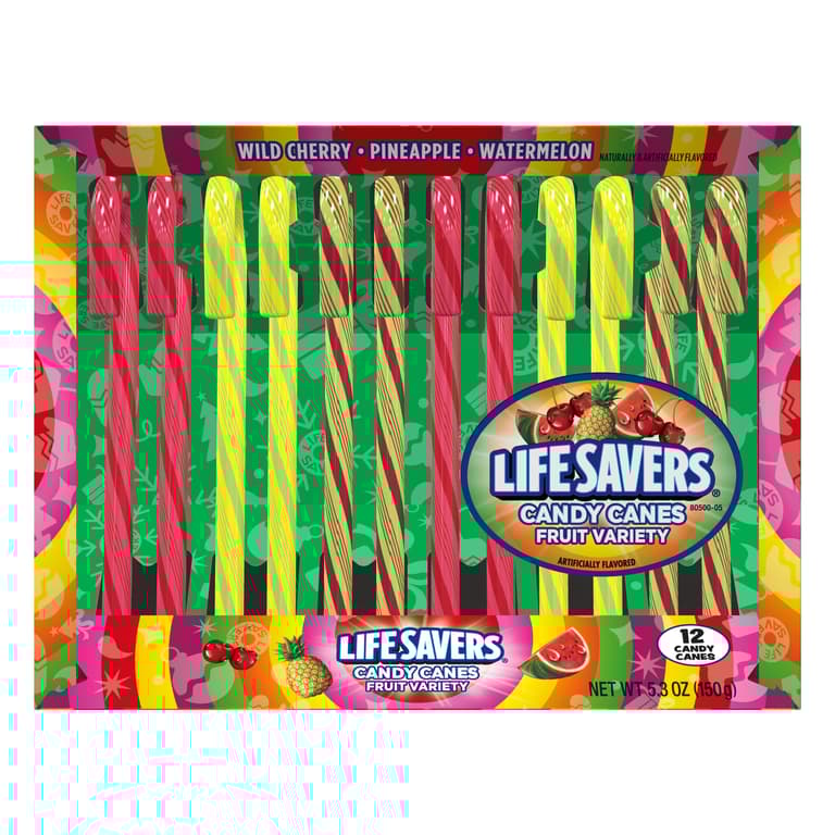 LIFESAVER CANDY CANES COME IN A 12 COUNT BOX OF THREE AMAZING FLAVORS THAT INCLUDE WILD CHERRY PINEAPPLE AND WATERMELON.Specifications