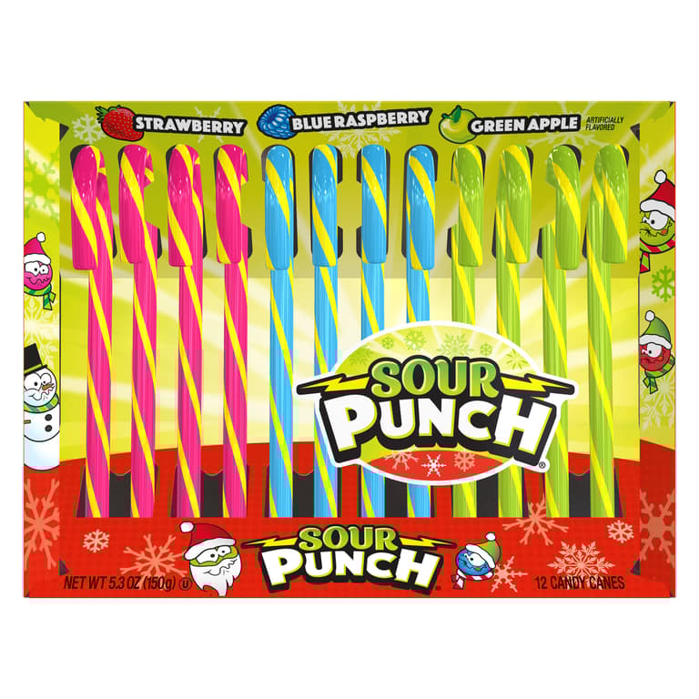 SOUR PUNCH CANDY CANES COME IN A 12 COUNT BOX OF 3 SOUR FLAVORS THAT INCLUDE STRAWBERRY BLUE RASPBERRY AND GREEN APPLE. THESE ARE THE PERFECT ADDITION TO ALL OF YOUR STOCKINGS AND CHRISTMAS TREES THIS YEAR. .Specifications