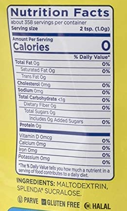 Our Splenda zero-calorie granulated sweetener measures cup-for-cup like sugar, tastes like sugar, and has zero calories. It is a perfect zero-calorie sugar alternative for sweetening all of your favorite recipes, baked goods, and beverages and our 9.7oz granulated sweetener pouch sweetens the same as 5 lbs of granulated sugar!Specifications