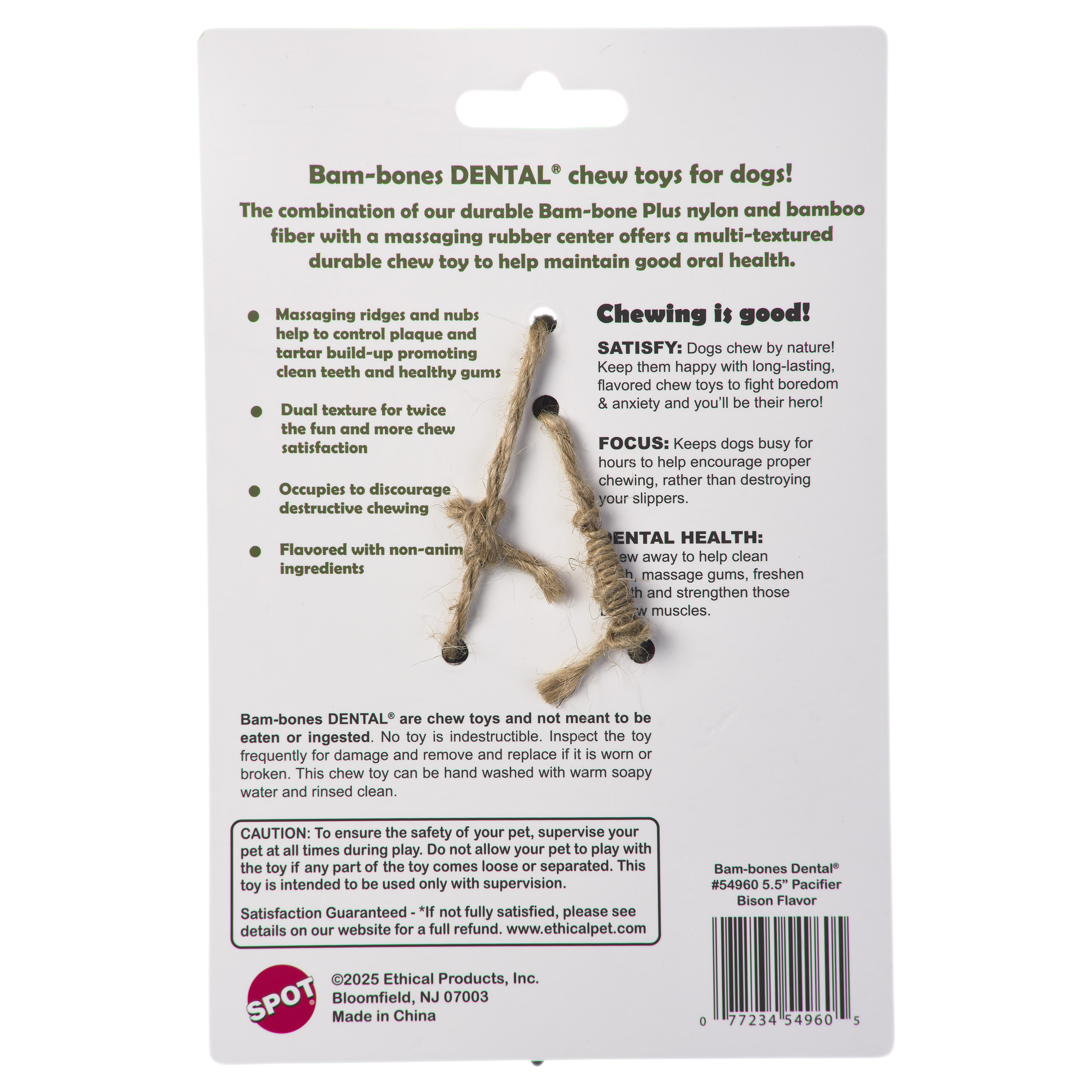 5.5" Dental Pacifier in bison flavor; Dual textured with massaging rubber center; Flavored with non-animal ingredients; Massaging ridges and nubs help maintain good oral health; Occupies to discourage destructive chewing