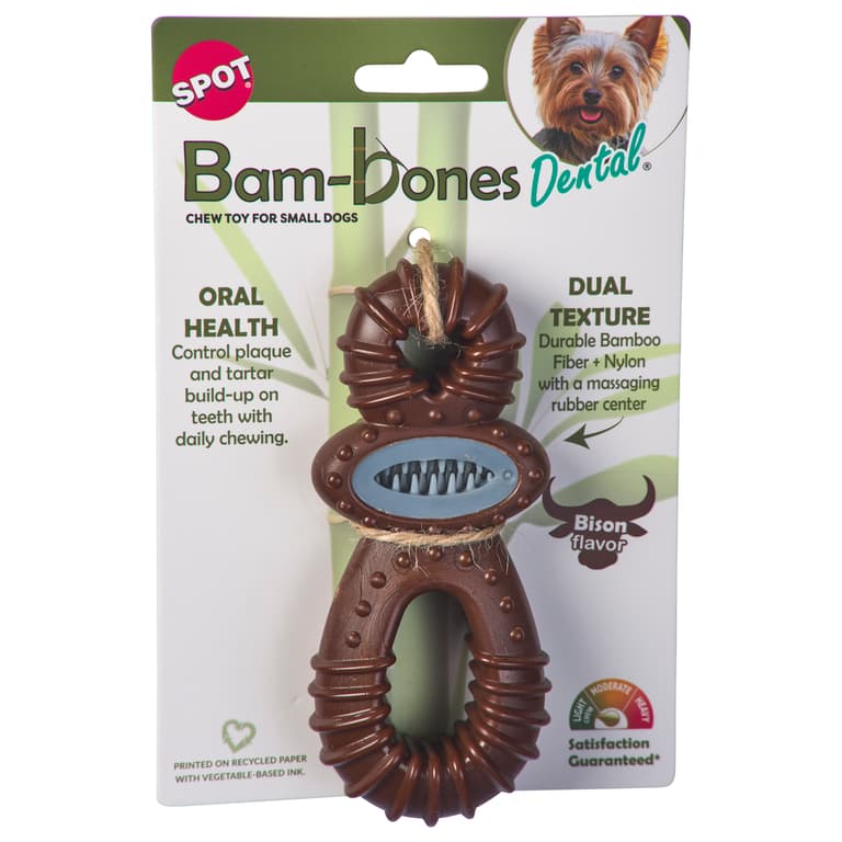 Bam-bones Dental chew toy for dogs combines durable nylon and bamboo fibers with a massaging rubber center that offers a multi-textured chew toy to help maintain good oral health. Massaging ridges and nubs help to control plaque and tartar build-up. Dual texture for twice the fun and more chew satisfaction. Occupies to discourage destructive chewing. Flavored with non-animal ingredients.Specifications