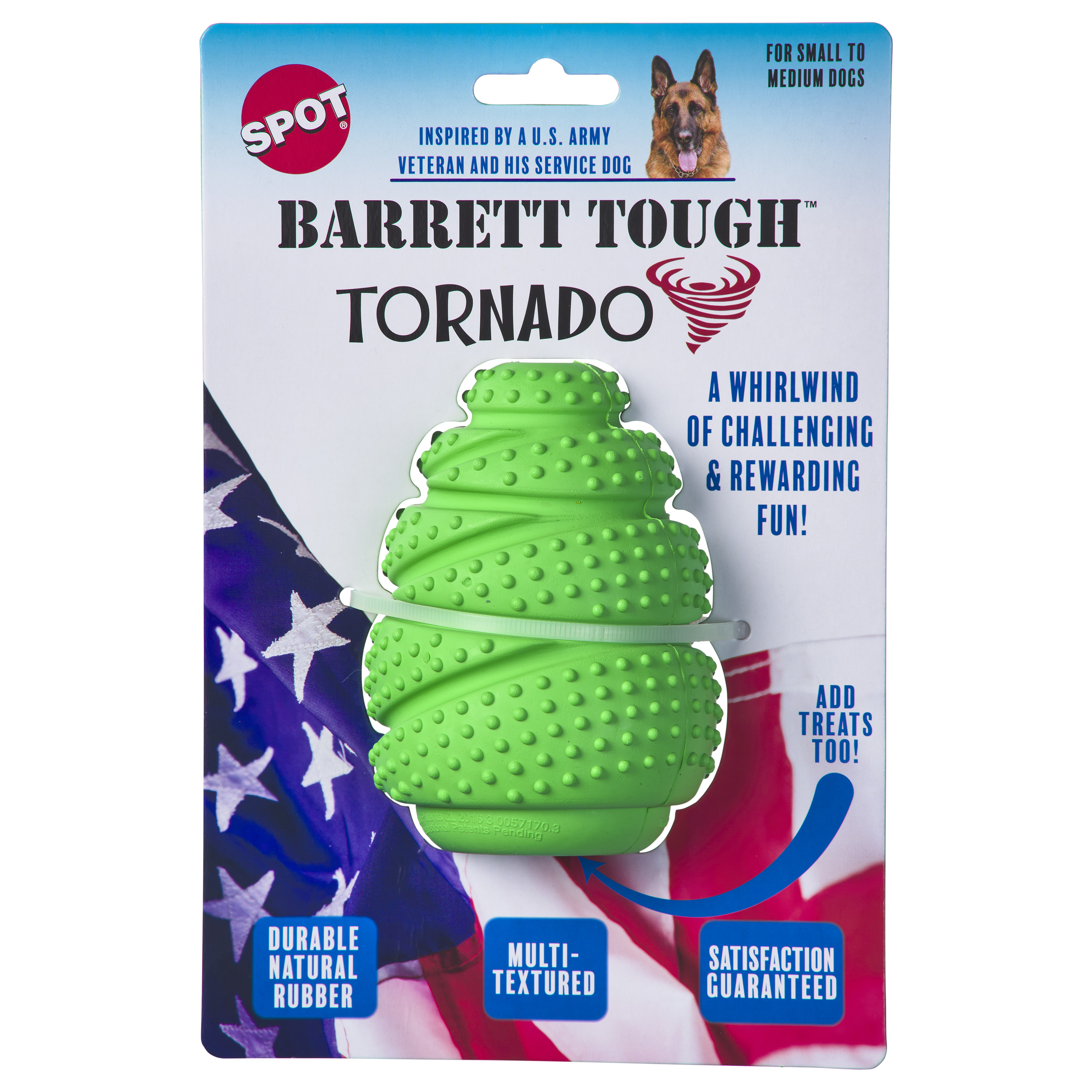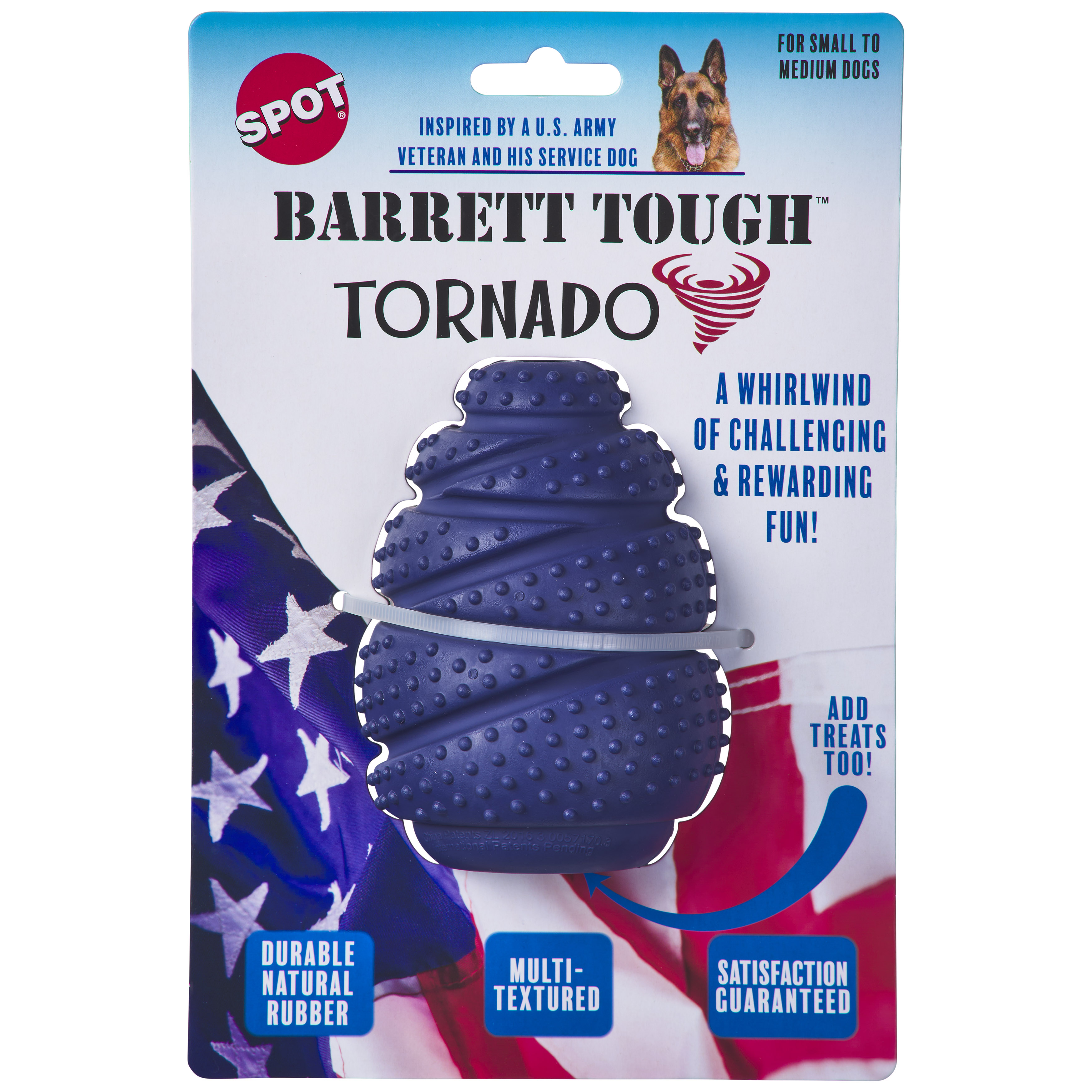 Add treats for a rewarding playtime; Barrett Tough Tornado 4.25"; Groovy, bumpy texture feels good on teeth and gums; Made from durable, all natural rubber; Spirals and curves make it easy to grip, toss and tug