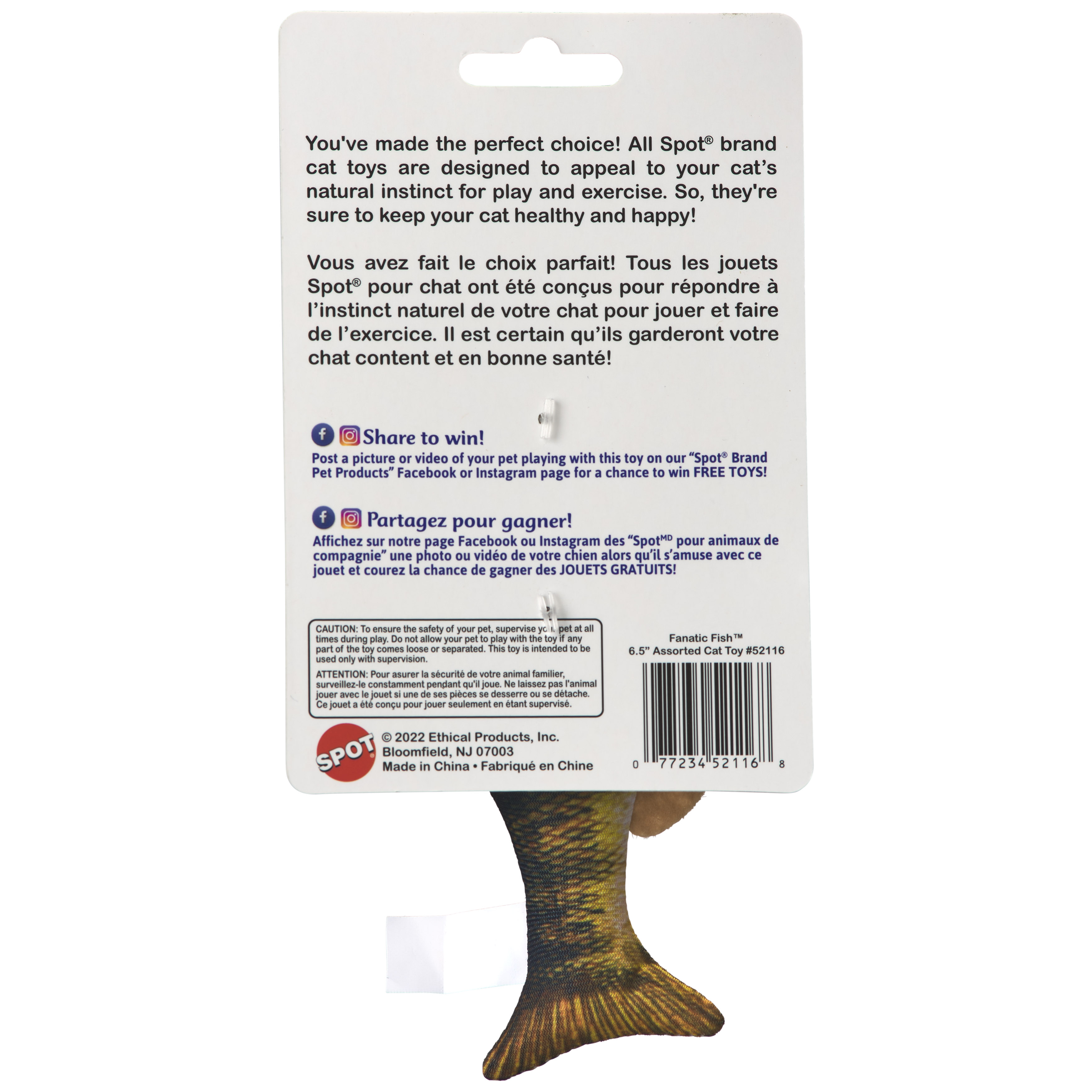 6.5 in; Crinkle sound; Irresistible catnip; Lifelike fish