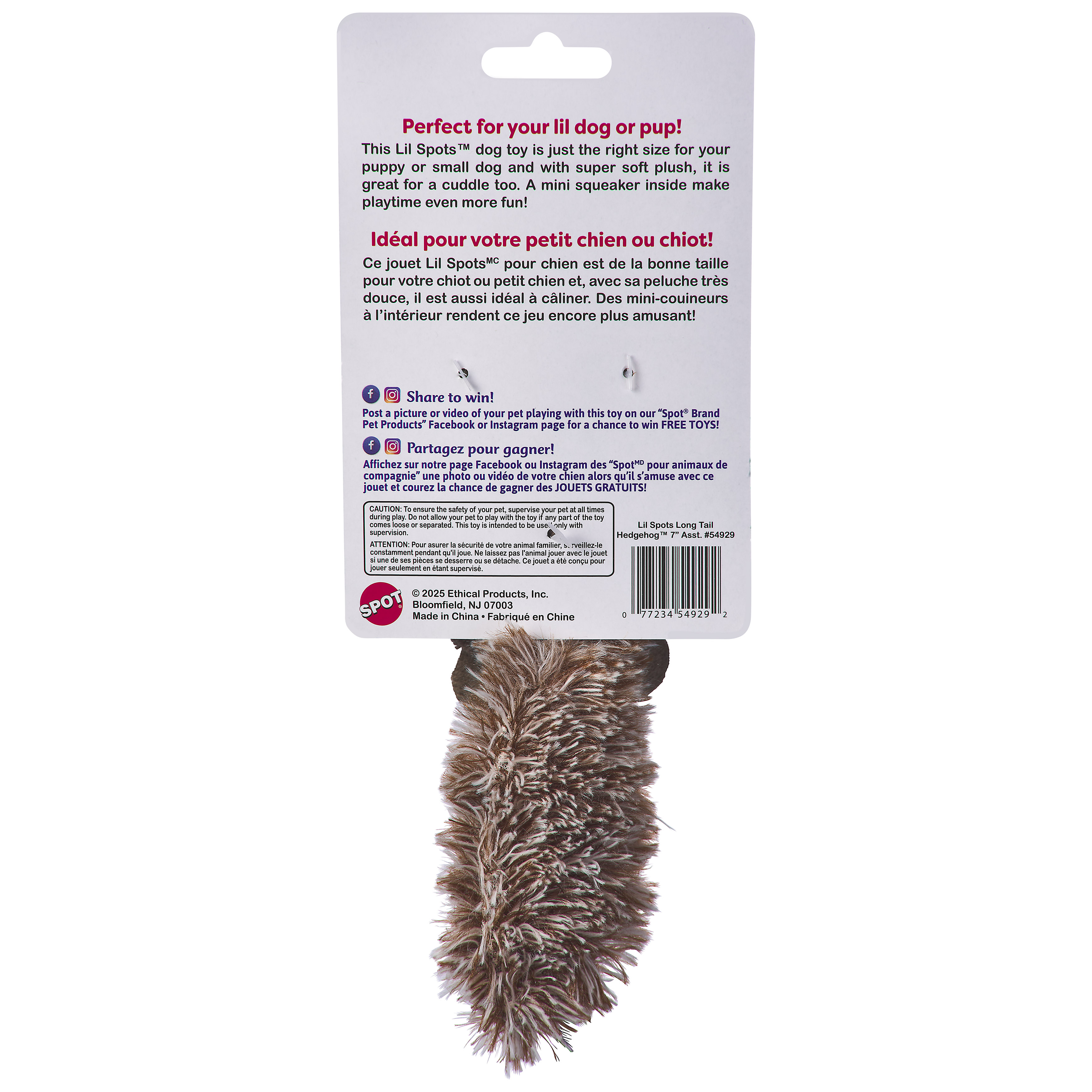 (WE CANNOT GUARANTEE A SPECIFIC COLOR) If you'd like us to choose for you, we are more than happy to do so. If not, please visit us in store to pick your favorite color.This Lil Spots dog toy is just the right size for your puppy or small dog. With super soft plush, it is great for cuddling. A mini squeaker inside makes playtime even more fun.Specifications