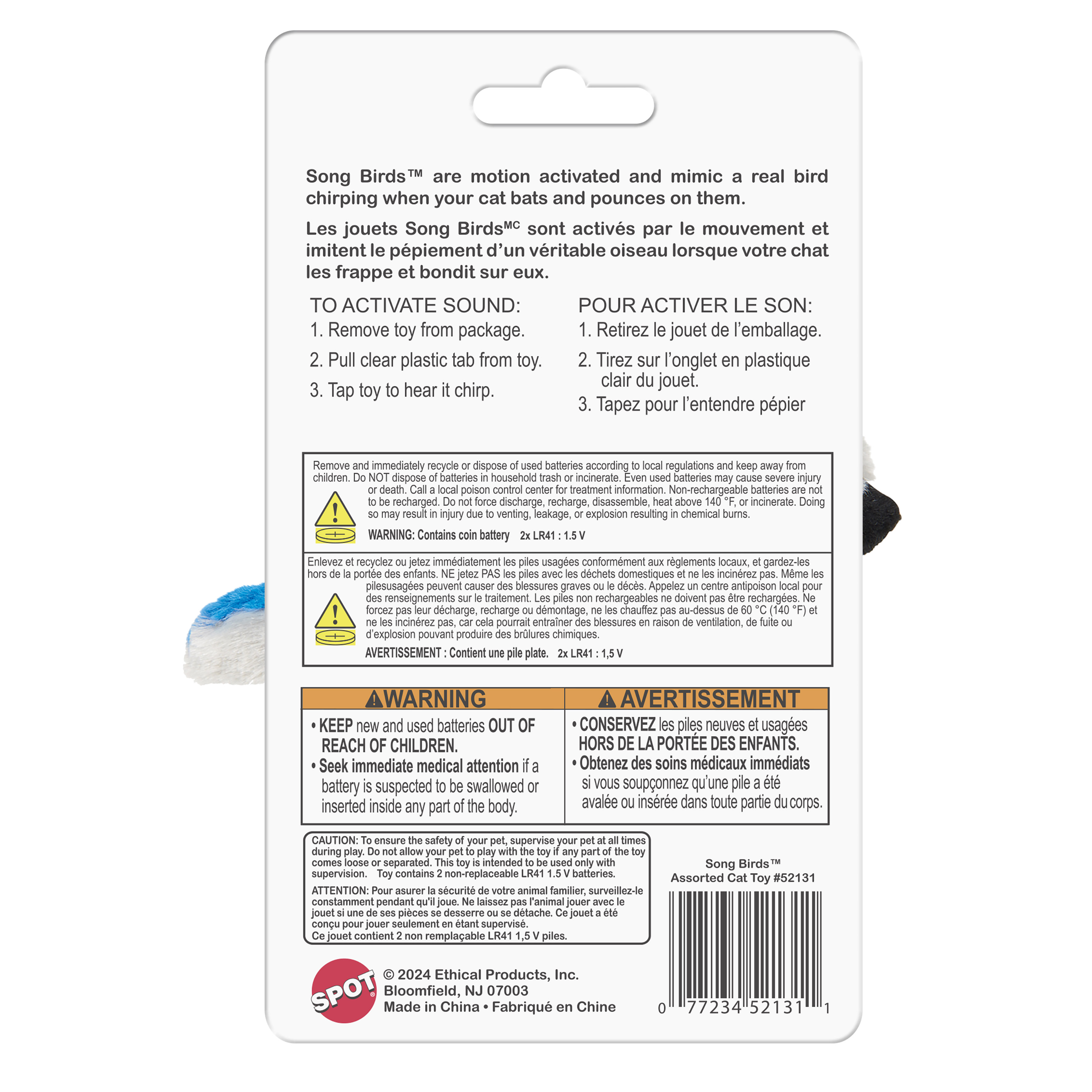 (WE CANNOT GUARANTEE A SPECIFIC STYLE OR COLOR) If you'd like us to choose for you, we are more than happpy to do so. If not, please visit us in store to choose your favorite color.Song Birds cat toys will encourage your cats hunting instinct with their realistic appearance and chirping sound. Assorted plush birds that sing a song when batted around.Specifications