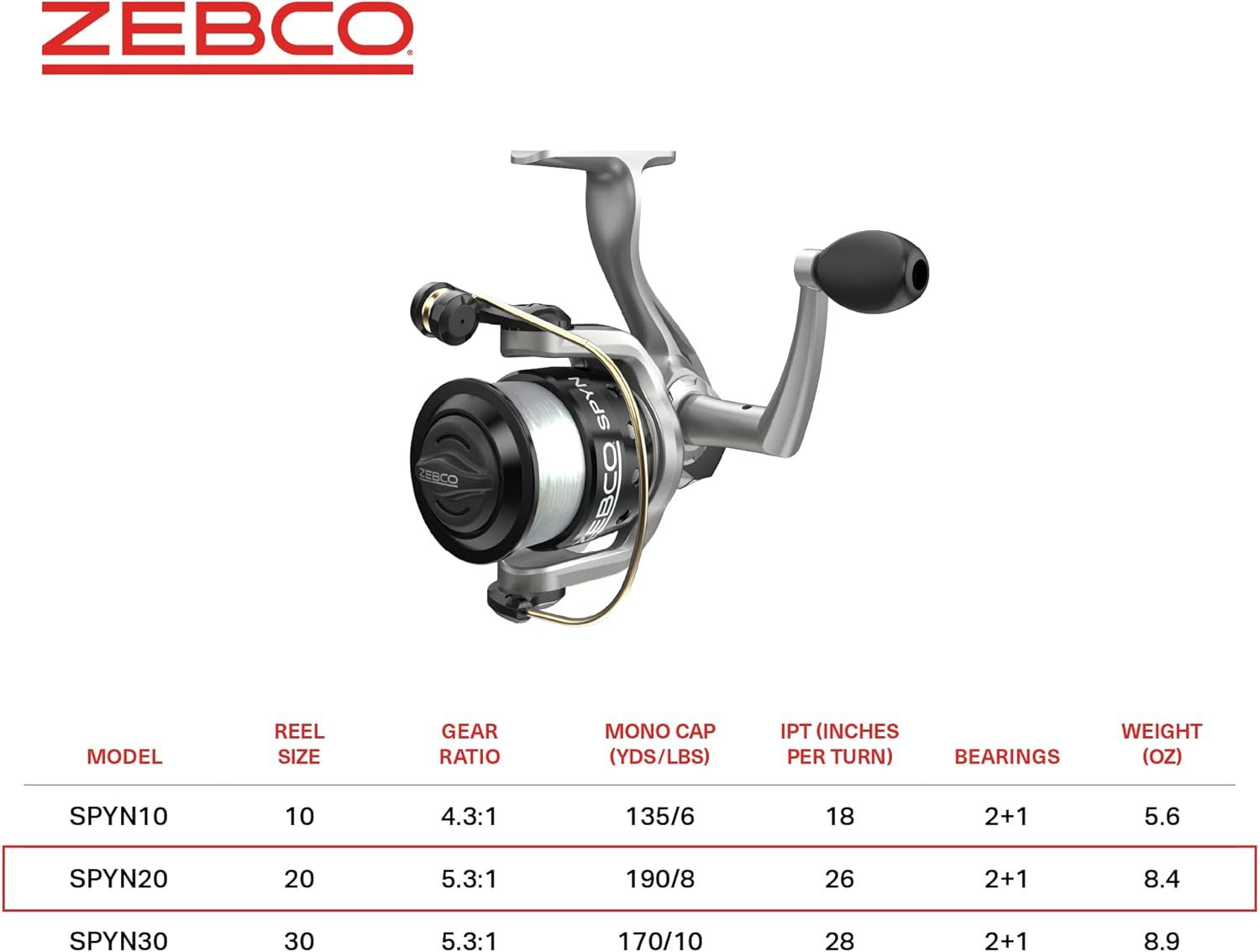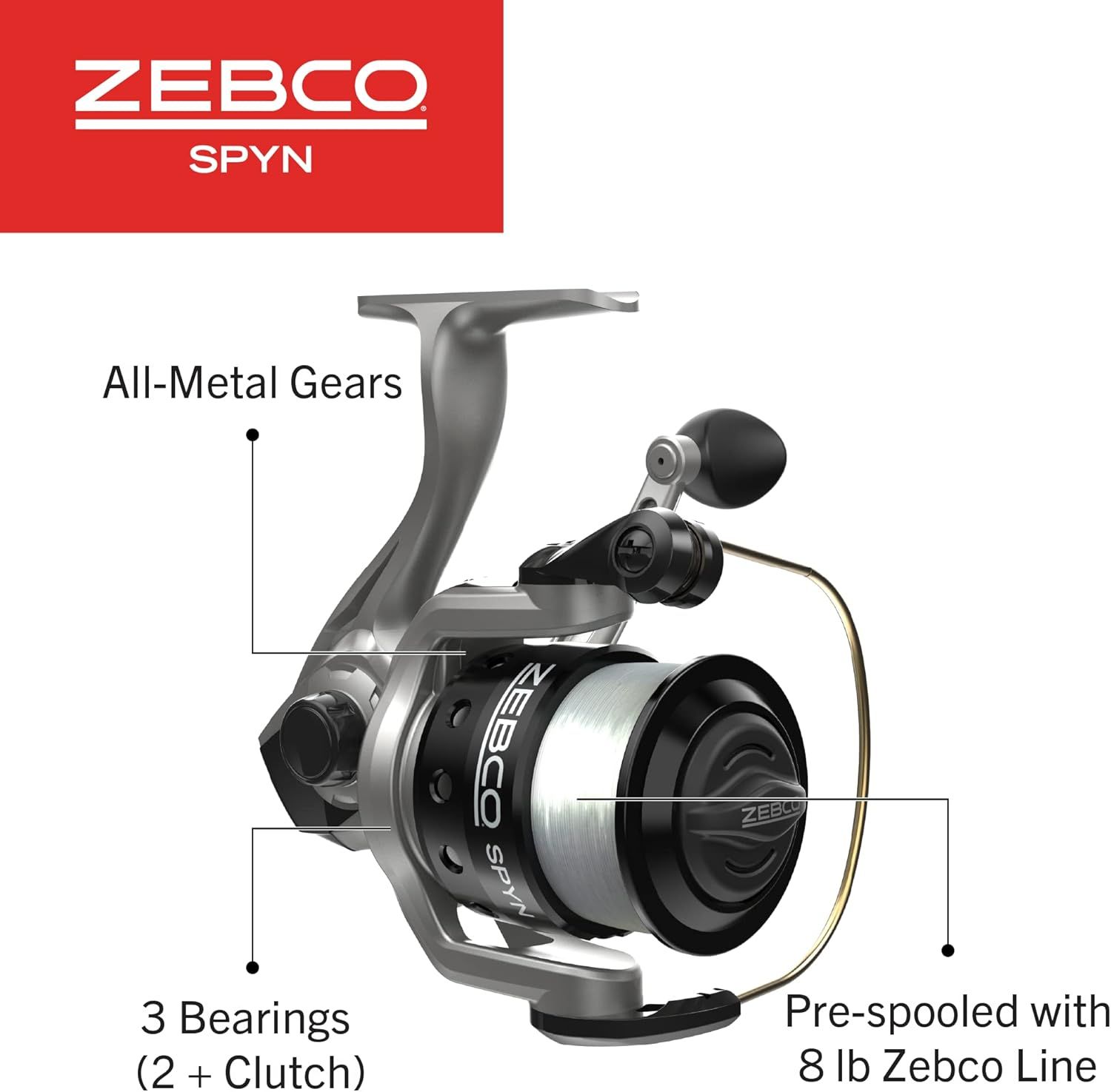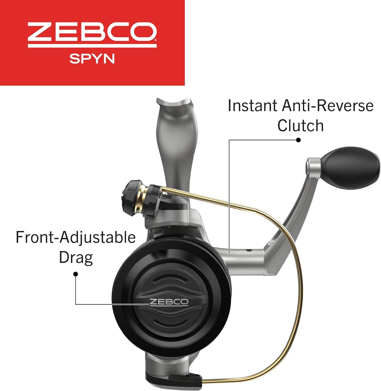 Zebco's Spyn reels feature an Instant Anti-Reverse clutch, aluminum spool and super tough titanium-nitride plated bail wire and line roller and are pre-spooled with Zebco line. Fishing is about more than just catching fish. It’s about seeing new sights and experiencing things with friends and family for the first time. All you need to get hooked is some reliable, easy-to-use Zebco gear and a sense of adventure.Specifications