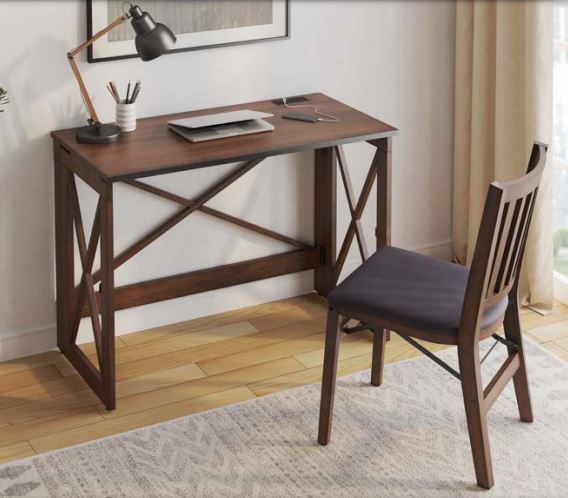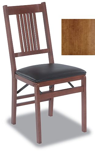 This Stakmore True Mission Style chair with 6 vertical slats coming down from a horizontal top rail with a shaped curve in the top and bottom rail back. Perfect to accompany our Stakmore folding desk or at your dining table. The chairs are constructed of solid hardwoods with a steel folding mechanism and black padded upholstered seat.Specifications