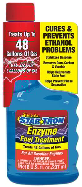 Star Tron Enzyme Fuel treatment is a multifunctional fuel additive which uses a unique enzyme technology that allows all engines to start easily and run smoothly even when using ethanol-blended fuel or after sitting idle for months. Star Tron allows fuel to burn more completely which results in maximum performance fuel efficiency and reliable operation. Star Tron will stabilize fuel for up to 2-year preventing the formation of gums and other solids that clog carburetors and fuel injectors. Star Tron helps prevent phase separation by dispersing water throughout fuel as submicron sized droplets that can be safely eliminated while the engine operates. Star Tron Small Engine formula is ideal for use in all gas engines including boats cars trucks motorcycles small equipment as well as engines that use pre-mix fuel. Star Tron concentrated Formula 930 for fuel tanks larger than 48 GalSpecifications