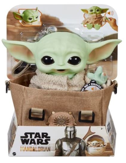 11 INCH CHILD PLUSH TOY; CAN STAND; COMES IWH T ASATCHEL LIKE THE ONE IN SEASON 2 OF THE MANDALORIAN; LEGS, ARMS AND EARS ARE POSABLE; SQUEEZE THE CHILD'S HAND TO HEAR SOUNDS FROM THE SHOW