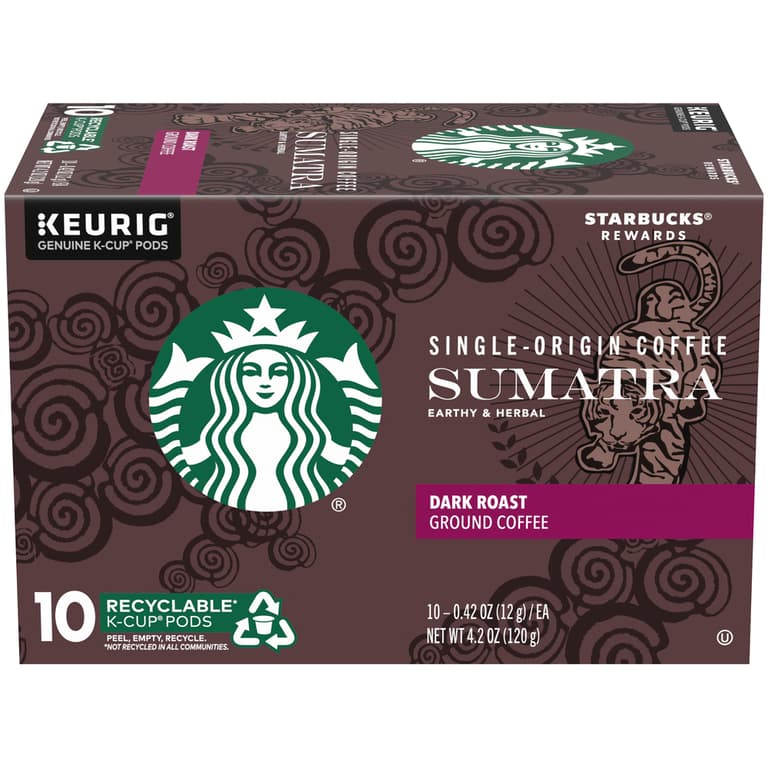 Like the Sumatran tiger this coffee makes its presence known. Its big and bold with distinctive earthy aroma and lingering low notes; Starbucks K-Cup pods are designed for use with the Keurig Single Cup Brewing System; The heavy full body and concentrated herbal spice notes are hallmarks of great coffee from Sumatra; Were updating our K-Cup pods to be recyclable