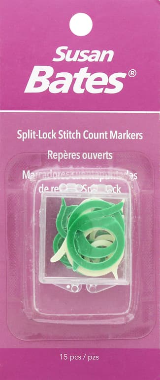 Susan Bates Stitch Count Markers Split Lock 15pc- These markers are slipped through completed work to mark points of increase, decrease, buttonhole placement, or any other necessary marking. Colors are green and white. Includes a clear storage box.Specifications