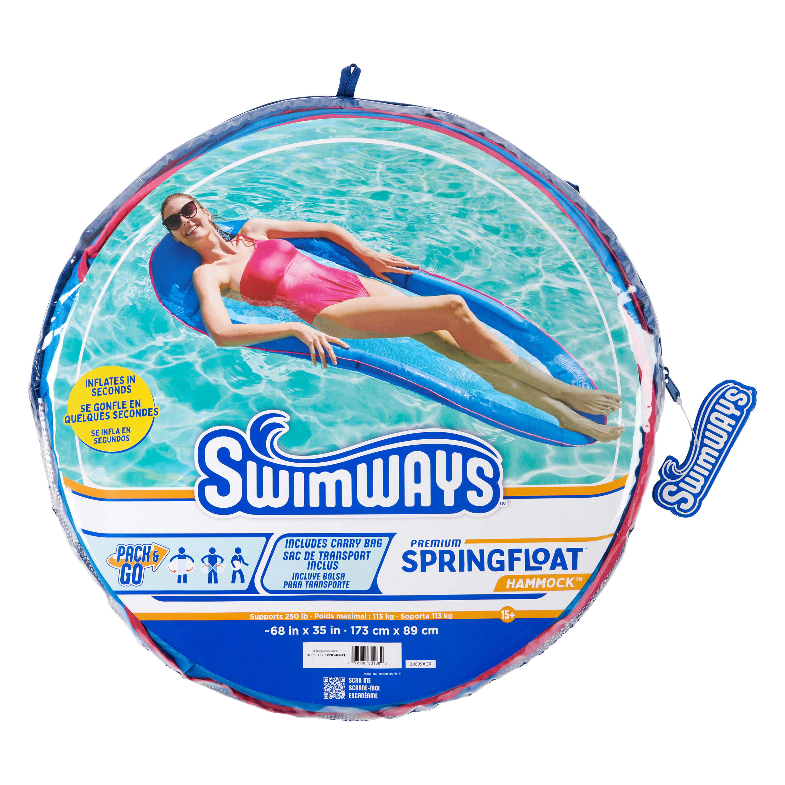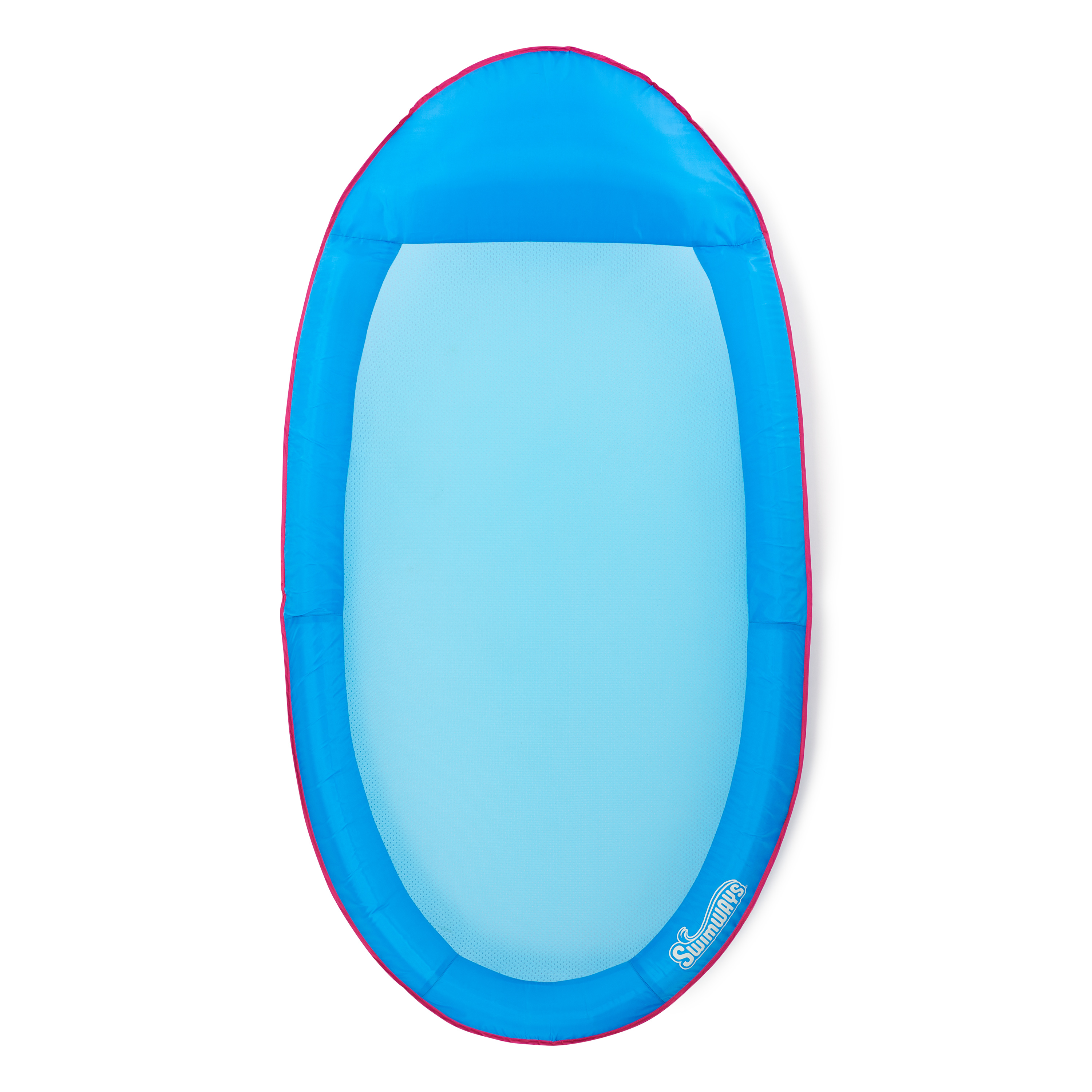 Float through summer with the SwimWays Spring Float Original Pool Lounge Chair. This hammock-style pool float features a soft cooling mesh that keeps your body just below the water's surface to keep you comfortably cool for hours of relaxation and fun on hot summer days. The oversized inflatable pillow supports your head and neck so you can keep your head and hair mostly dry while the cares of everyday life drift away. The patented inner spring around the outside edge of the float provides greater comfort and stability in the water to keep you afloat. Our patent-pending Hyper-Flate Valve minimizes direct contact while maximizing airflow, allowing for easy inflation in a fraction of the time. The unique pump-free design prevents air from escaping between breaths for our fastest and easiest inflation ever, so you have more time to spend in the water doing what you love. Deflate just as quickly by inserting the tail of the valve cap. The bright blue design adds a pop of color and style to your outdoor pool space. This pool float folds down flat into three compact circles and includes a reusable carry bag for easy portability and storage, making it great for trips to the pool or travel. The SwimWays Spring Float Original Pool Lounge Chair measures 68 in x 35 in x 6 in when fully inflated and supports most adults up to 250 lbs.Specifications