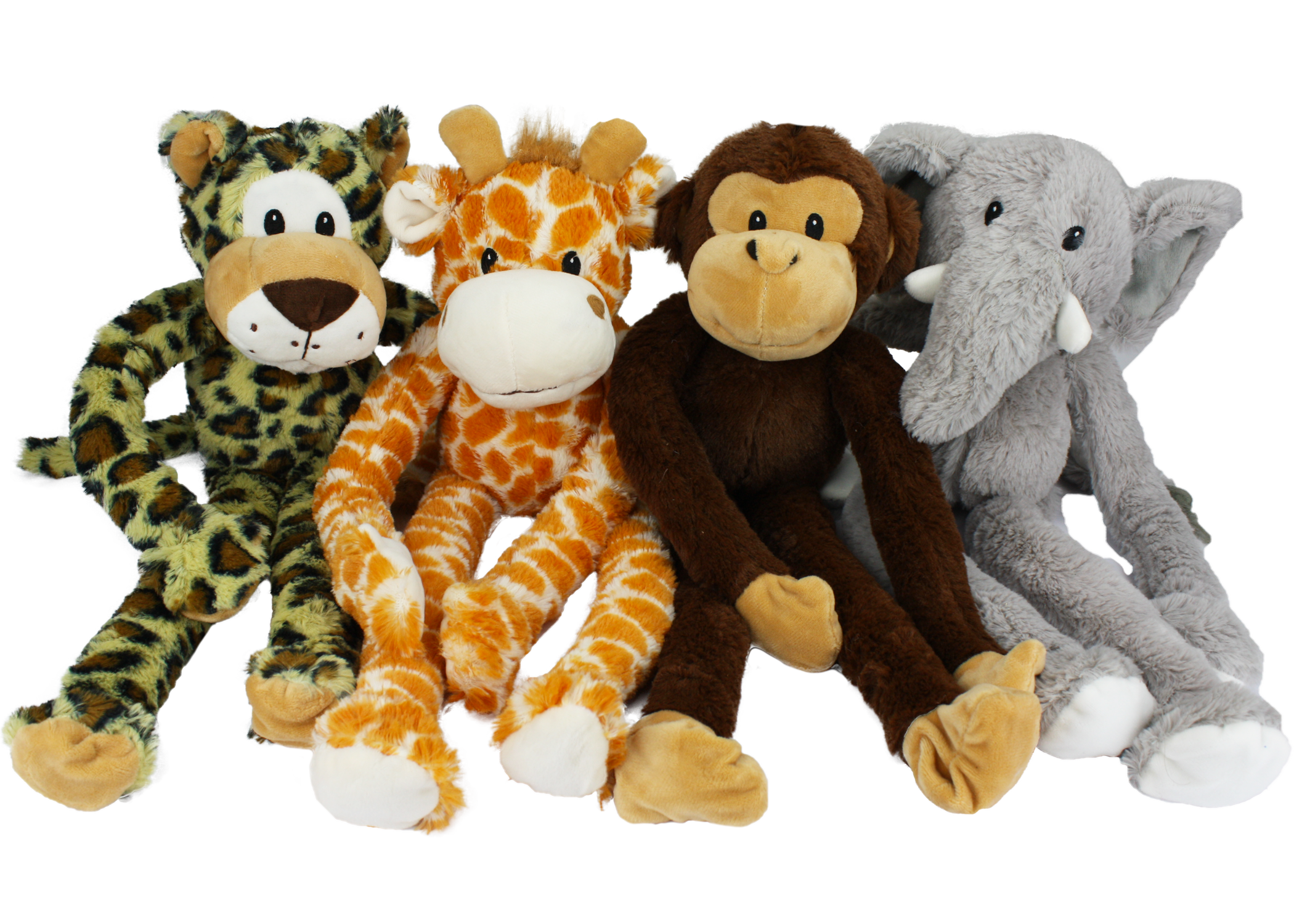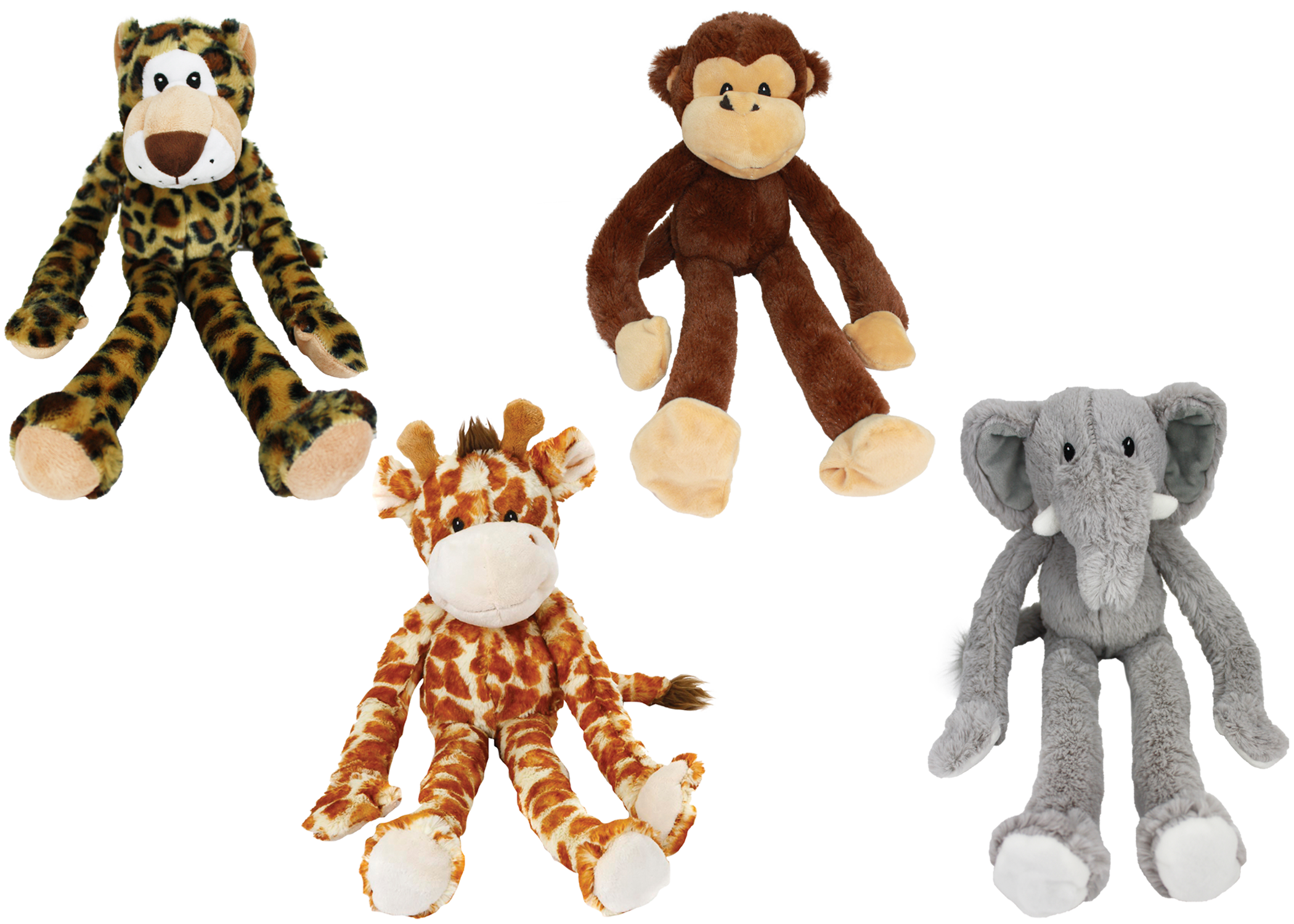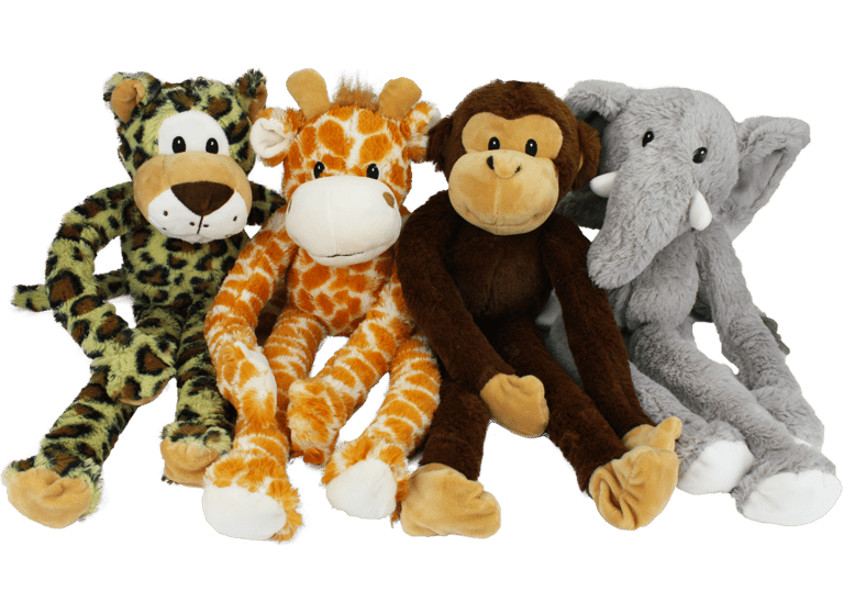 (WE CANNOT GUARANTEE A SPECIFIC STYLE OR COLOR)If you'd like us to choose for you, we are more than happy to do so. If not, please visit us in store to pick your favorite color." Swingin’ Safari dog toys are the plush, animal-themed pals your pet needs in their dog toy bin. Swingin’ Safari toys have extra long arms and squeak when squeezed! Available in assorted styles of elephant, giraffe, leopard, and monkey.Each dog toy measures 19 inches. Suitable for medium and large dogs. Please supervise your pet while this product is in use."Specifications
