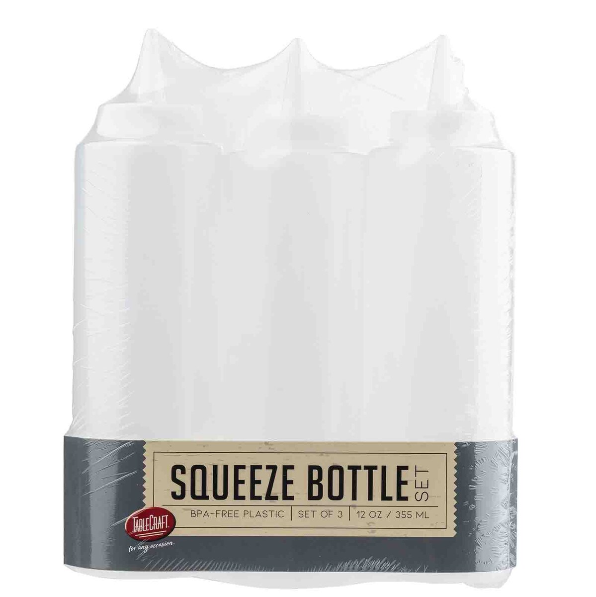 Simplify condiment storage and dispensing with the TableCraft 12 OZ Squeeze Bottle Set. This 3-pack of versatile squeeze condiment bottles is perfect for holding and dispensing sauces, dressings, oils, and more. Designed for precision and ease, these bottles are ideal for home cooking, barbecues, and professional kitchens. Made from food-grade low-density polyethylene (LDPE), these plastic sauce bottles are lightweight, squeezable, and durable enough to handle frequent use. Each bottle is equipped with a standard TipTop nozzle for controlled dispensing, making it easy to drizzle, squirt, or pour your favorite condiments without mess or waste. The 12 oz size is compact yet functional, offering ample storage while remaining easy to handle. The transparent design ensures quick content identification and monitoring, so you’ll always know when it’s time for a refill. Whether you’re decorating plates, adding BBQ sauce to grilled dishes, or preparing a salad, these clear condiment bottles are a practical and stylish solution. Care Instructions: Dishwasher safe for quick and hassle-free cleaning, the TableCraft 12 OZ Squeeze Bottle Set combines convenience, durability, and functionality, making it a must-have for any culinary enthusiast or grilling masterSpecifications