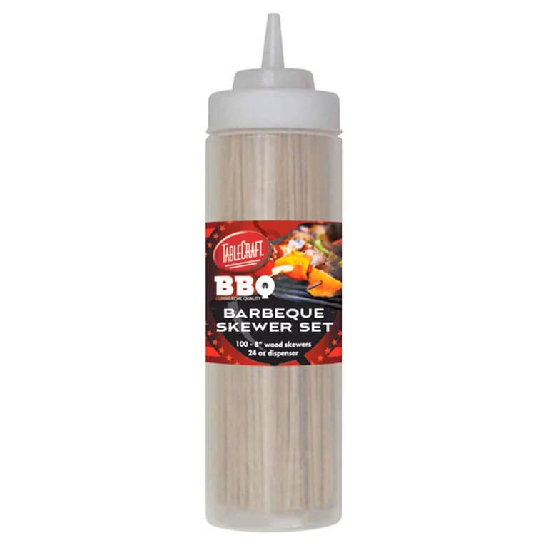 Bamboo skewers are eco-friendly and biodegradable; Great for grilling shish kabobs, corn, meats, vegetables, hot dogs and more; Includes 100 8" Bamboo Skewers & 24 oz Clear Squeeze Bottle