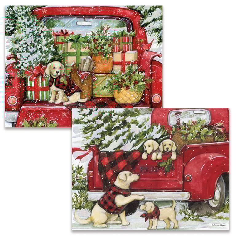 Send two varieties of artwork with LANG Format/Assorted Boxed Christmas cards. The Puppies & Presents Format/Assorted Boxed Christmas Cards include two variations of Susan Winget's Red Truck holiday artwork on linen embossed paper stock. Each assortment has its own holiday greeting inside.Specifications
