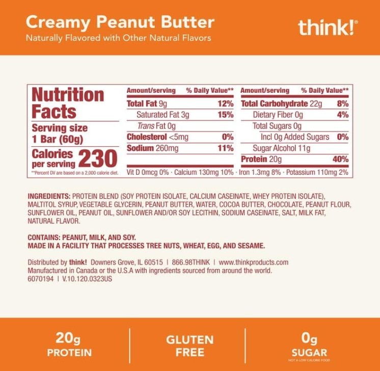 Each think! bar combines the delicious, crave-worthy flavors you love with the satisfying protein punch you need to support your goals. Every bite of this Creamy Peanut Butter protein bar is packed with the timeless and delicious combination of creamy peanut butter and luscious chocolate flavor. So, whether you are on the go, need a snack out on the trail, or crave a quick bite before your workout, grab a think! bar.20 grams protein: Our highest protein bar is for consumers seeking a multipurpose nutritional bar that can go from an energy boosting snack to a meal replacement when paired with a piece of fruit.0 grams Sugar: No artificial sweeteners - Does not contain sucralose, saccharin, aspartame, Acesulfame potassium, neotame or advantame. Great for those watching their sugar intake (low GI).We take pride in selecting ingredients with no artificial colors or flavors. All ingredients have been produced without genetic engineering.Helps support lean muscle, muscle recovery and growth, and satiety.Specifications