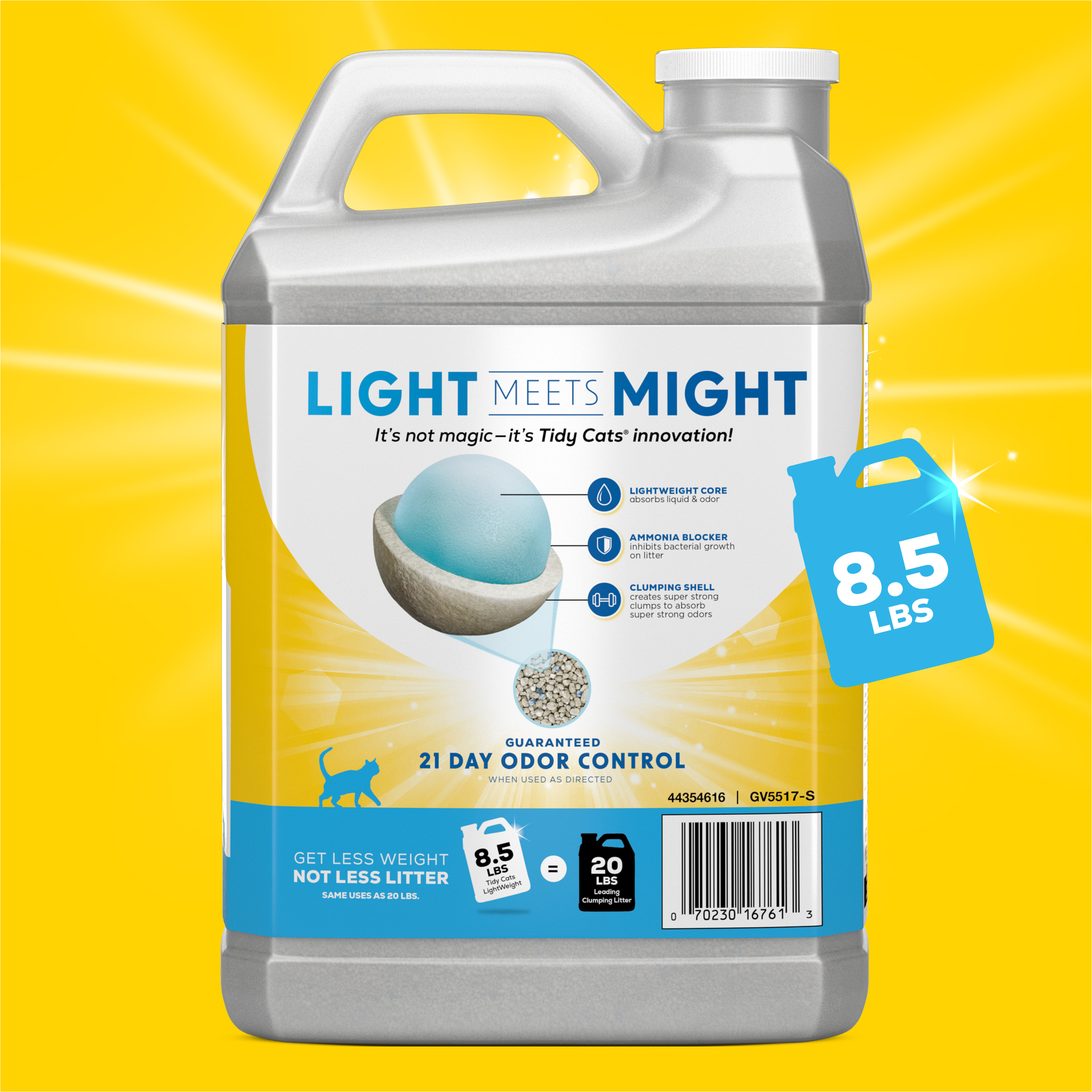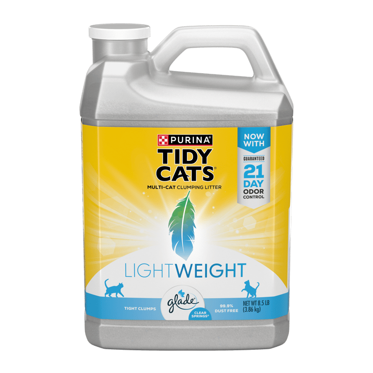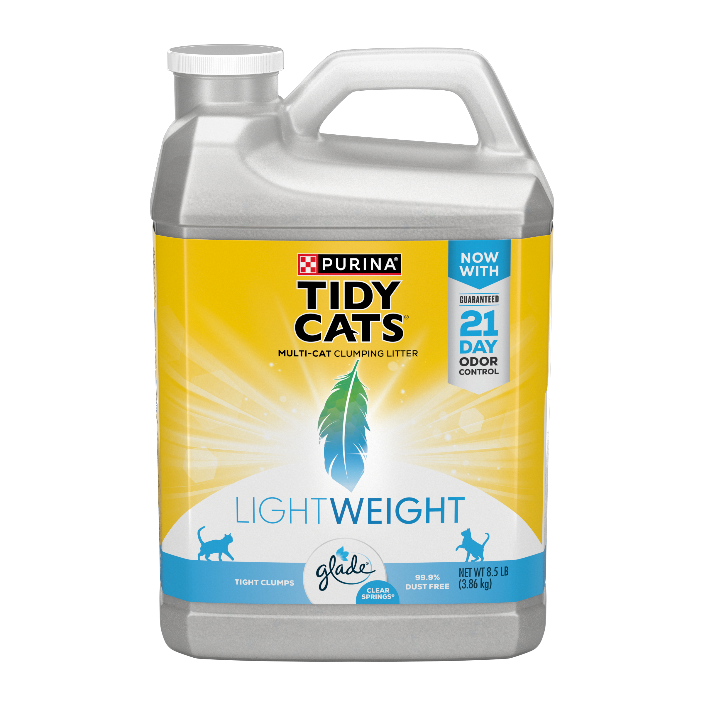 Bring the power of two trusted names in odor control to your home with Purina Tidy Cats LightWeight With Glade Clear Springs scoopable cat litter. This lightweight litter neutralizes ammonia, urine and fecal odors, keeping each litter box smelling clean and pleasant. A powerful Ammonia Blocker prevents ammonia odor from forming for 21 days when used as directed, and the low dust formula enables a clean, easy pour during litter changes. This clay litter defends against strong odors with Glade, leaving behind a fresh fragrance. At less weight than leading clumping kitty litter, this Tidy Cats clumping litter forms strong, tight clumps, making litter box maintenance a simple task. Formulated for multiple cats, this litter box odor control formula with Glade Clear Springs stands up to regular use by all your feline family members, and the moisture-locking technology keeps them dry and comfortable. Easily check litter box cleaning off your list with this powerful scented cat litter.Specifications