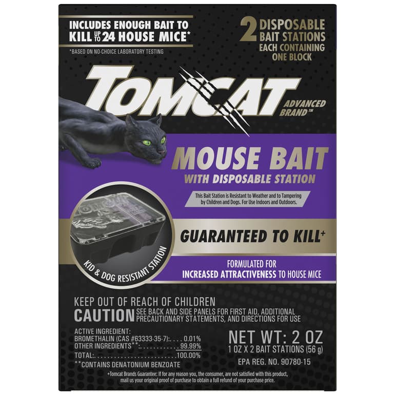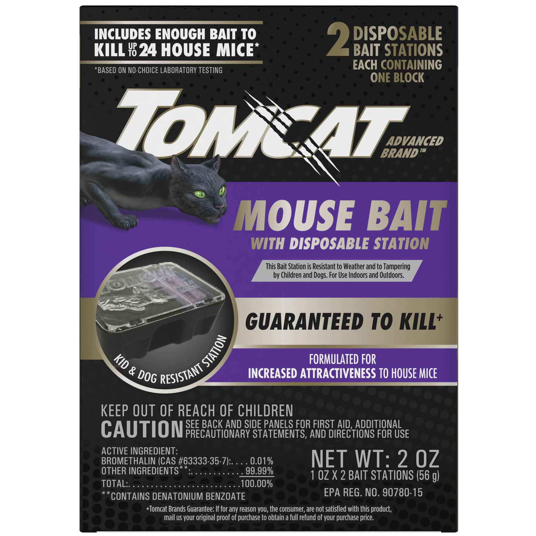 Each block of Tomcat Advanced bait can kill up to 12 house mice (based on no-choice laboratory testing). Bait stations with mouse poison should be placed beside burrows, along walls, behind kitchen appliances, inside cabinets, in garages and basements, and along the exterior of the home. If more than one station is being used, place them at 8- to 12-foot intervals.Specifications