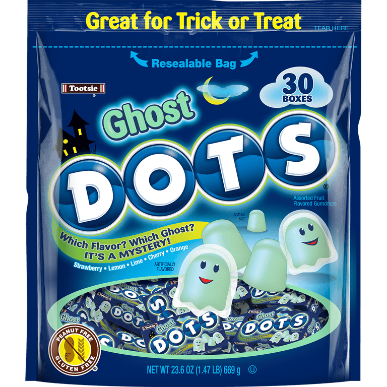 WHICH FLAVOR WHICH GHOST ITS A MYSTERY. DOTS GHOST GUMDROPS ARE FIGHTENINGLY DELICIOUS AND PERFECT FOR HALLOWEEN. GHOST DOTS HAVE SOME TRADITIONAL DOTS FLAVORS BUT EACH PIECE IS A MYSTERY.Specifications