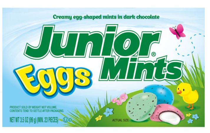 SPRINGTIME IS HERE AND THAT MEANS JUNIOR MINTS CANDY EGGS ARE HERE. ENJOY A COOL REFRESHING MINT CENTER COATED IN DARK CHOCOLATE WITH EASTER PASTEL COLORS. THESE ARE THE PERFECT CANDIES TO ADD TO ANY EASTER BASKET.Specifications