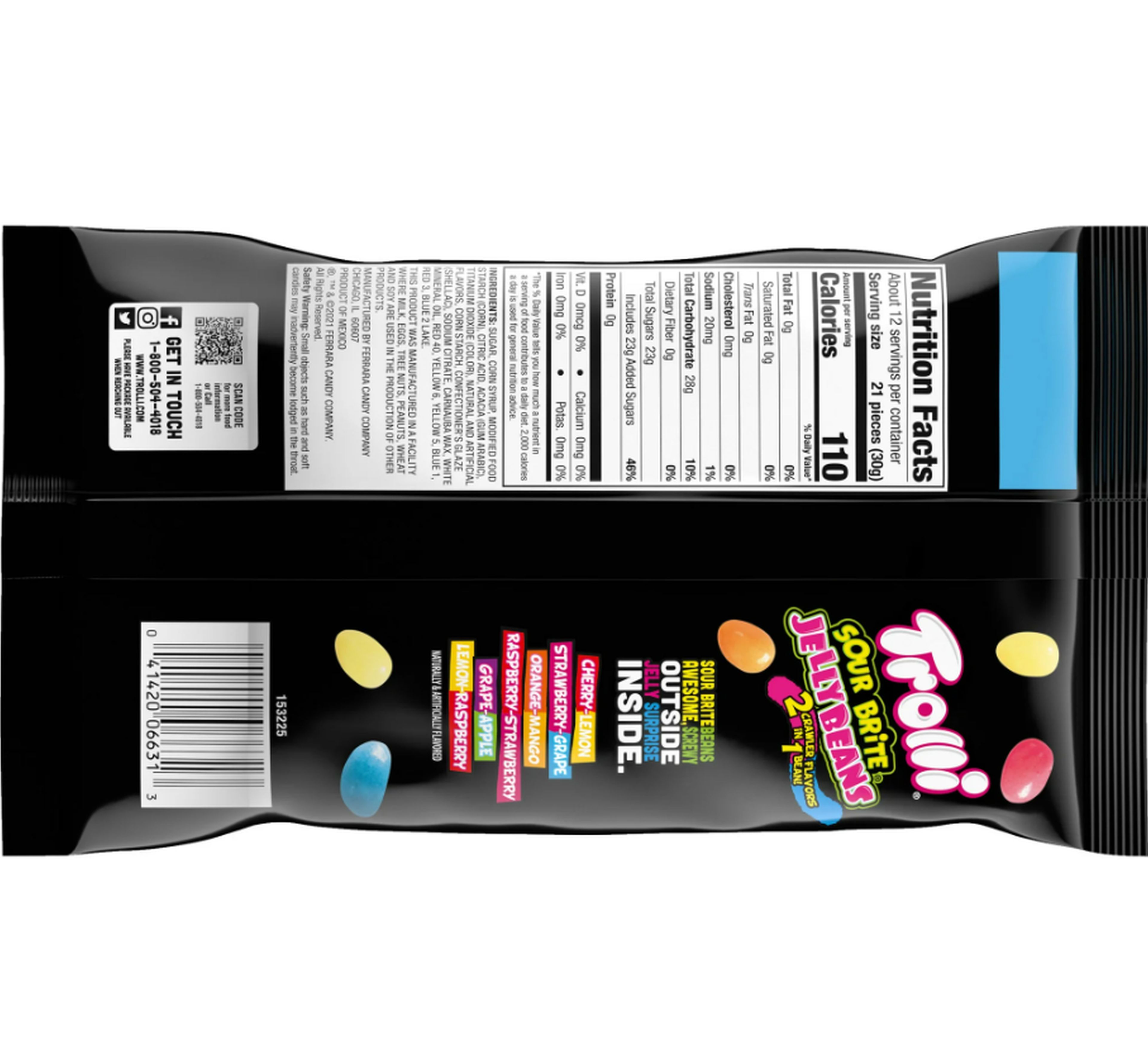 TROLLI SOUR BRITE JELLY BEANS FEATURE 2 CRAWLER FLAVORS IN 1 JELLY BEAN! THIS BAG INCLUDES SOUR CHERRY LEMON, SOUR STRAWBERRY GRAPE, SOUR ORANGE MANGO, SOUR RASPBERRY STRAWBERRY, SOUR GRAPE APPLE AND SOUR LEMON RASPBERRY.Specifications