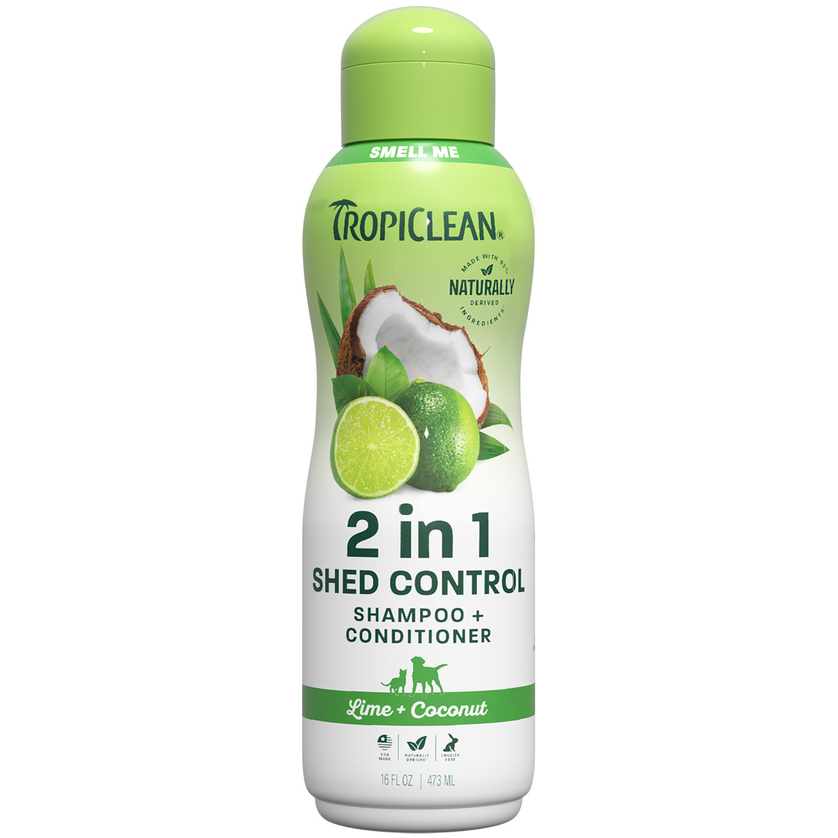 2 IN 1 SHED CONTROL shampoo & conditioner;; For use on dogs or cats, this pH formula cleanses, moisturizes & helps loosen tangles;; Lime & Coconut fragrance