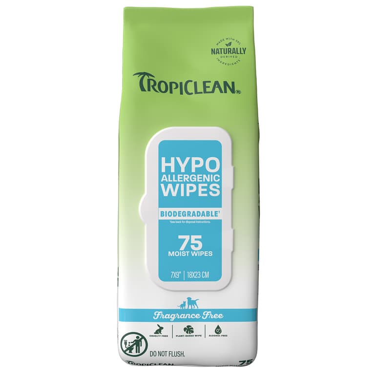 TROPICLEAN HYPOALLERGENIC PET WIPES make freshening up your furry friend a breeze. Formulated with a mild plant based cleanser, these ultra-gentle wipes effortlessly remove dirt, drool, and odors from your dog or cat’s paws, face, and body - leaving them clean, refreshed, and always ready for snuggles. Perfect for quick cleanups between baths!Specifications