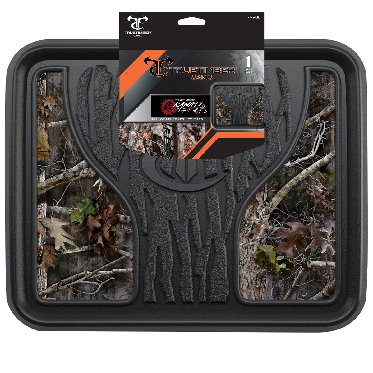 True Timber Kanati Camo utility floor mat protects your interior and adds rugged style to your vehicle. Durable all-weather rubber with recessed tree bark wells and camo inlay trap water, snow, and dirt. Universal design fits all popular trucks, vans, and SUVs. Anti-skid backing prevents sliding and shifting.Specifications