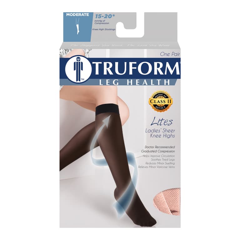 Truform ladies' sheer knee high support stockings provide graduated compression to help energize the legs - ideal when sitting or standing for long periods. Nylon-spandex materials are soft and resemble specialty store stockings. Fashionably sheer, soft fabric is suitable for business or leisure wearSpecifications