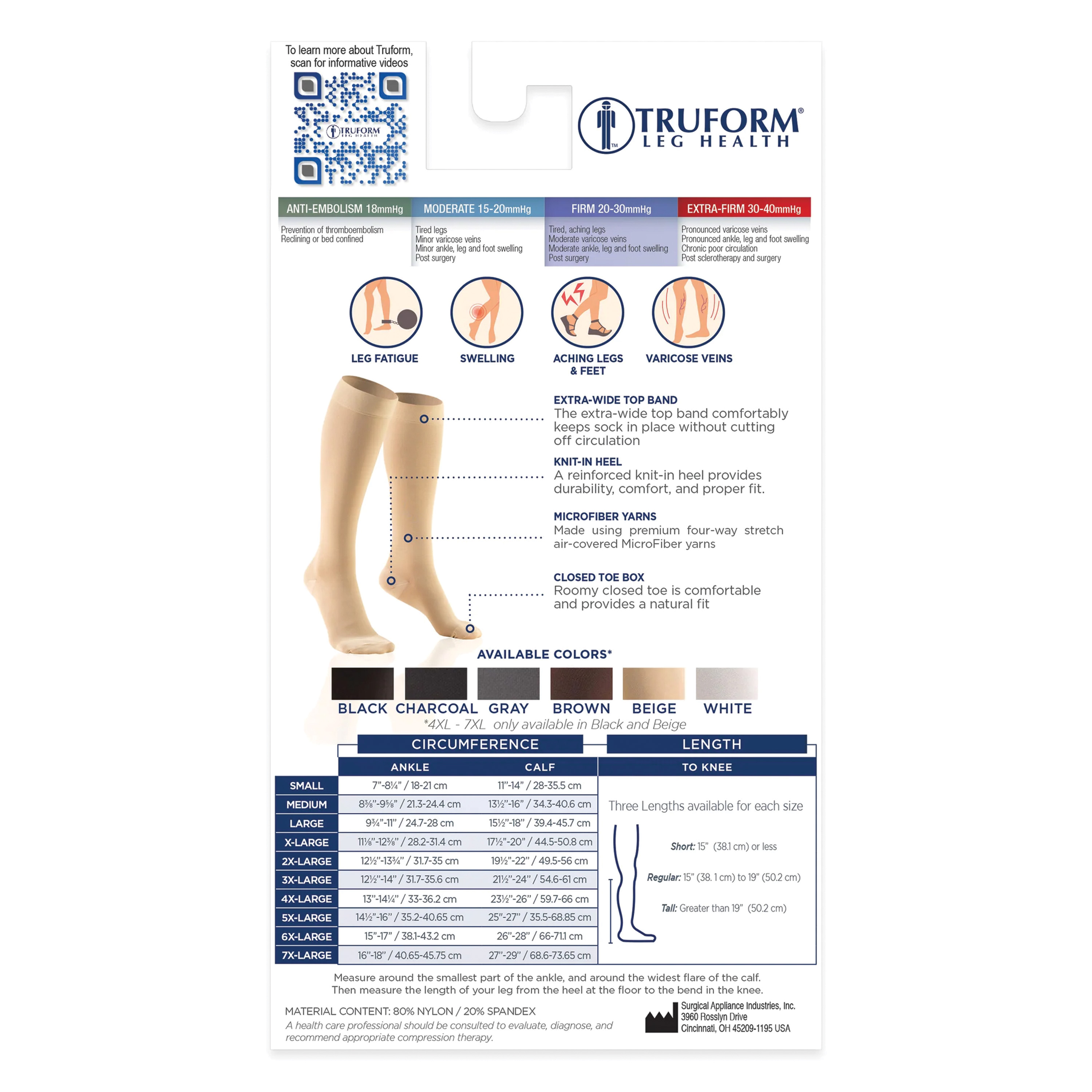 Designed to help relieve conditions associated with poor circulation. Truform medical stockings feature classic styling and a smooth knit texture fabric that conceals unsightly blemishes. For men and women.Specifications