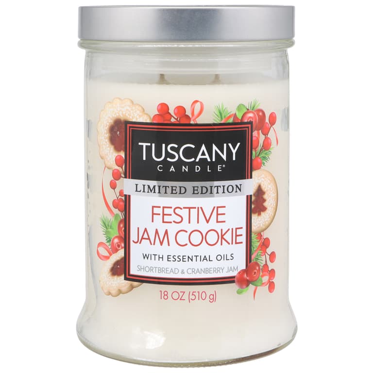 2 wicks; embossed brushed silver lid; Made with essential oils; poured in the USA.; Premium marbled wax; Spiced vanilla shortbread cookies topped with cranberry preserves and sugar