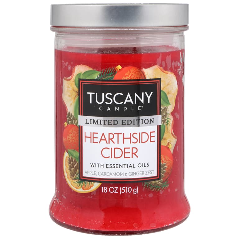 2 wicks; embossed brushed silver lid; Fresh homemade apple cider with warm winter spices, ginger zest, and vanilla bean; Made with essential oils; poured in the USA.; Premium marbled wax