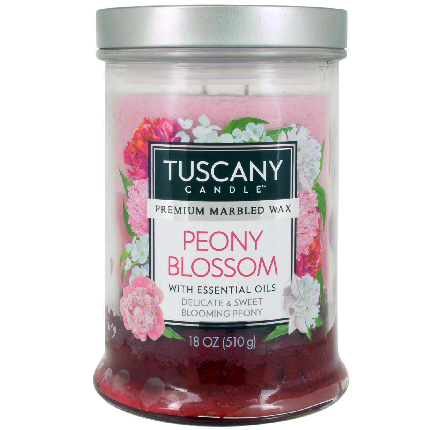 3.75 inches length x 3.75 inches width x 6 inches height; Embossed Tuscany lid; Poured in the USA; Premium marbled wax with two wicks