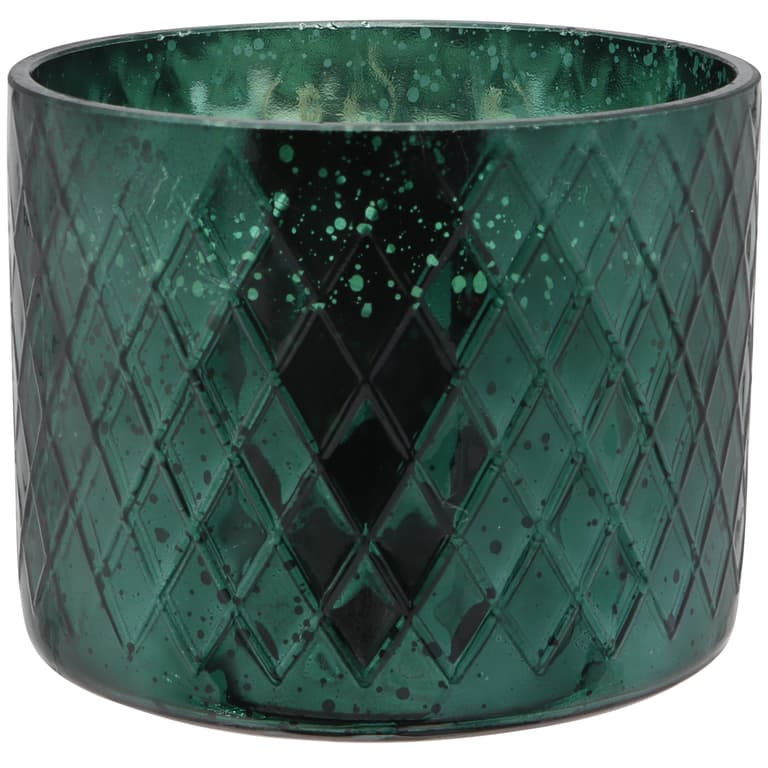 3 wicks; Charred firewood, black pepper, and smooth tonka sweetened with a hint of orange zest; Green diamond embossed mercury glass; made with essential oils; poured in the USA; premium satin white wax