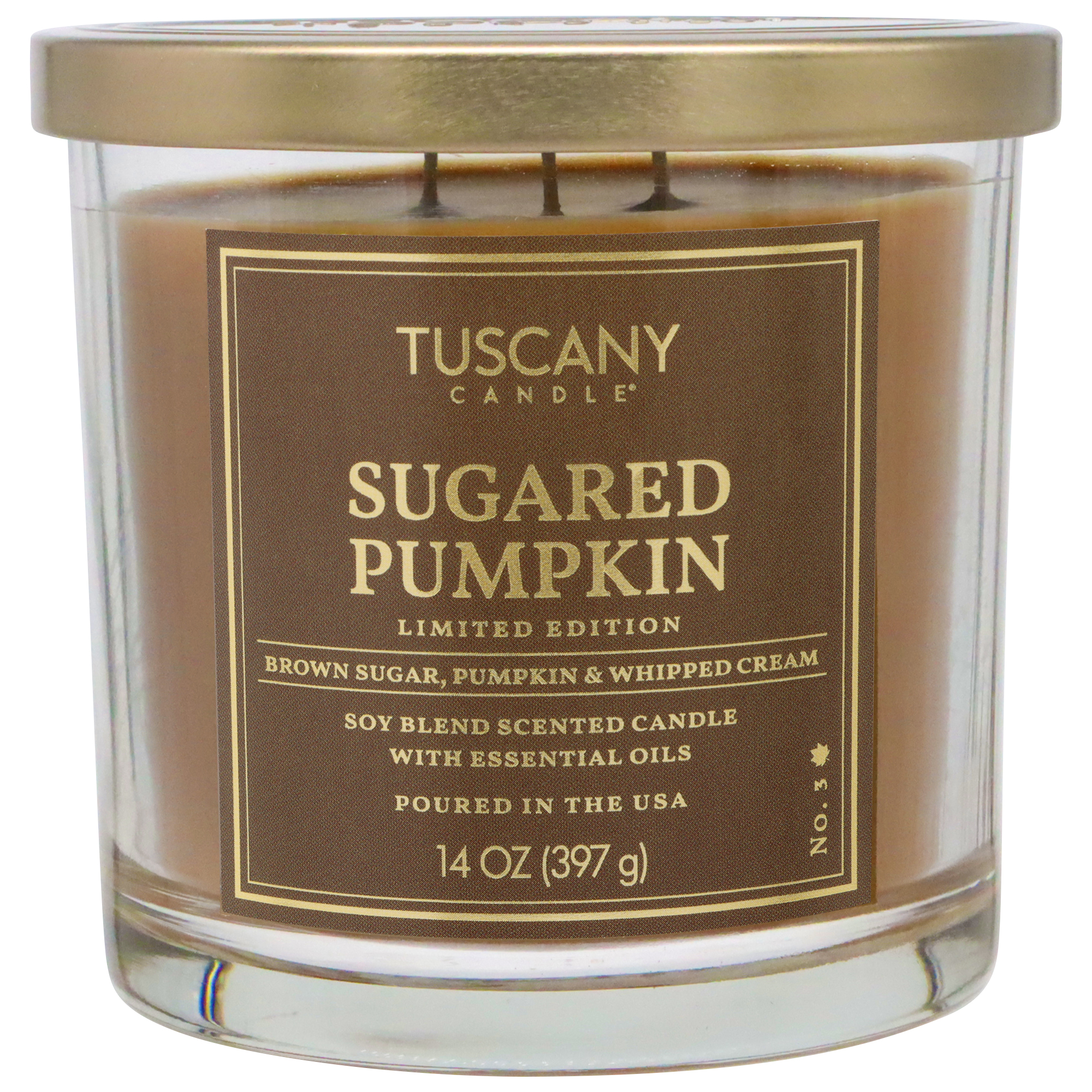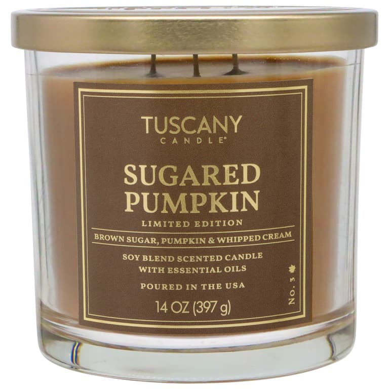 3 wick candle; gold lid; pumpkin puree, brown sugar and hint of ginger fragrance; updated new label