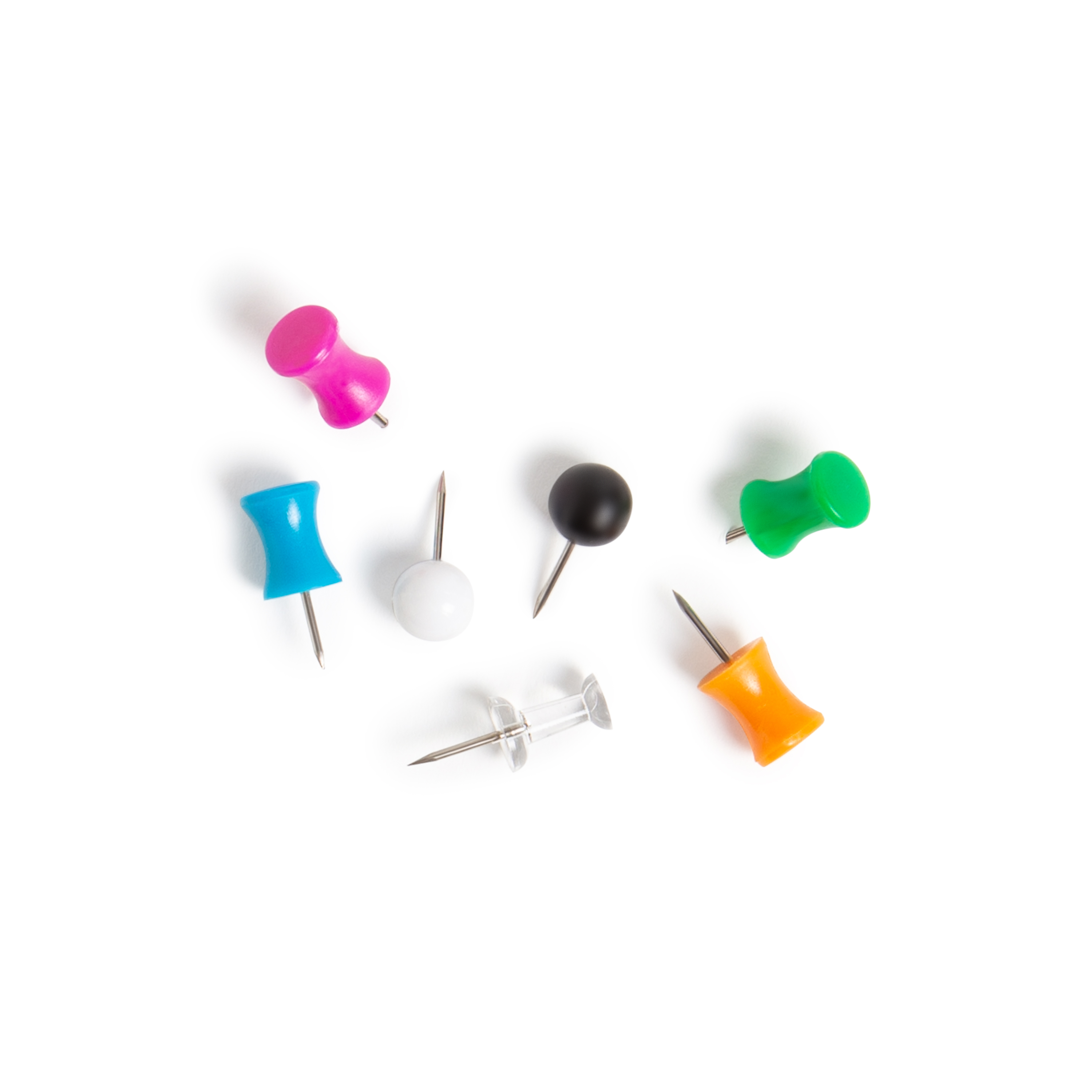 20 sphere push pins; 30 clear standard push pins; Assorted designs and colors, including white, clear, black, teal, orange, blue, and pink; Set of 80 push pins